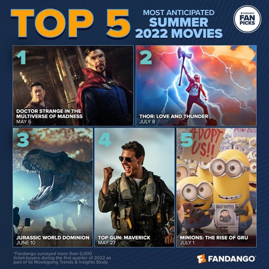 Fandango has shared the results of their annual Fandango’s Moviegoing Trends & Insights Study, revealing the ten most anticipated movies this summer. Unsurprisingly, Marvel Studios once again tops the list with Sam Raimi's Doctor Strange in the Multiverse of Madness taking the top spot and Taika Waititi's Thor: Love and Thunder coming in second.