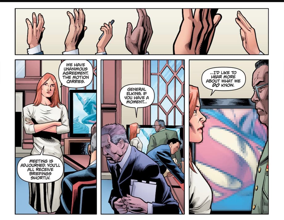 A closed meeting of the senate subcommittee on emerging threats and capabilities is taking place to discuss superman. A CGI simulation has been created to show the accuracy of superman’s powers and what potential threat he poses. Certain members make the subcommittee aware that superman is not human and so motivations, loyalties and psychology are all a mystery. They don’t know if he’s susceptible to mental illness, PTSD or dementia and need to form a team to analyse superman further.  Also he’s dealt with humanitarian missions only but many people are afraid that he may one day force himself on conflicts between nations and align with a country which unsettles many of the members. Senator Finch decides to call on superman to join them at a congressional hearing.
