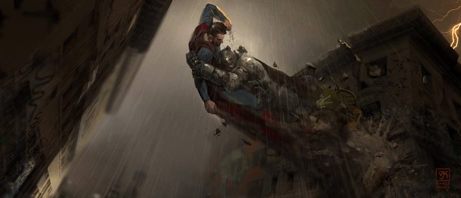 Clark arrives home to find out that Lois has been kidnapped. Many signs such as the Batarang point towards batman and so superman goes on a manhunt for him. His eyes glare towards the bat signal as it lights up in the sky and he hovers above finding batman on the ground in his armour. Superman questions him about Lois and gathers that it was him who kidnapped her. He tells him that this was too far, even for him. Batman states that superman does not abide by any rules and so the rules do not apply to him. He then tells superman that if a threat has emerged, he will destroy it at any cost. At this point superman feels as if batman was the one behind the bombings and deaths of those innocent lives and becomes emotional and angered, questioning his reasons for it. Now he doesn’t see him as a vigilante/hero but as a terrorist who is destroying lives in a misinterpreted effort to expose him. He declines his height and tells him that he will bring him to justice, taking him by the chest. Batman resists and starts firing the high frequency weapon and starts beating on him. They begin the epic fight.