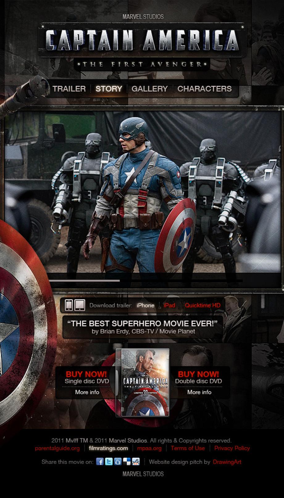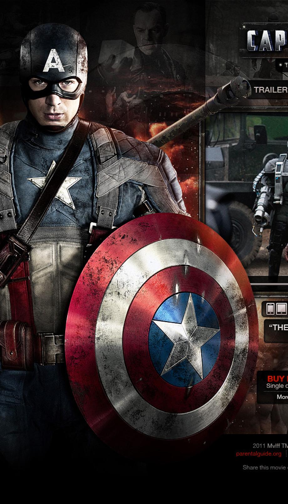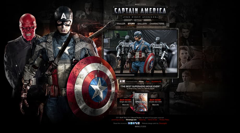 Website layout design pitch for Marvel Studios Captain America: The First Avenger. After being deemed unfit for military service, Steve Rogers volunteers for a top secret research project that turns him into Captain America, a superhero dedicated to defending America's ideals.