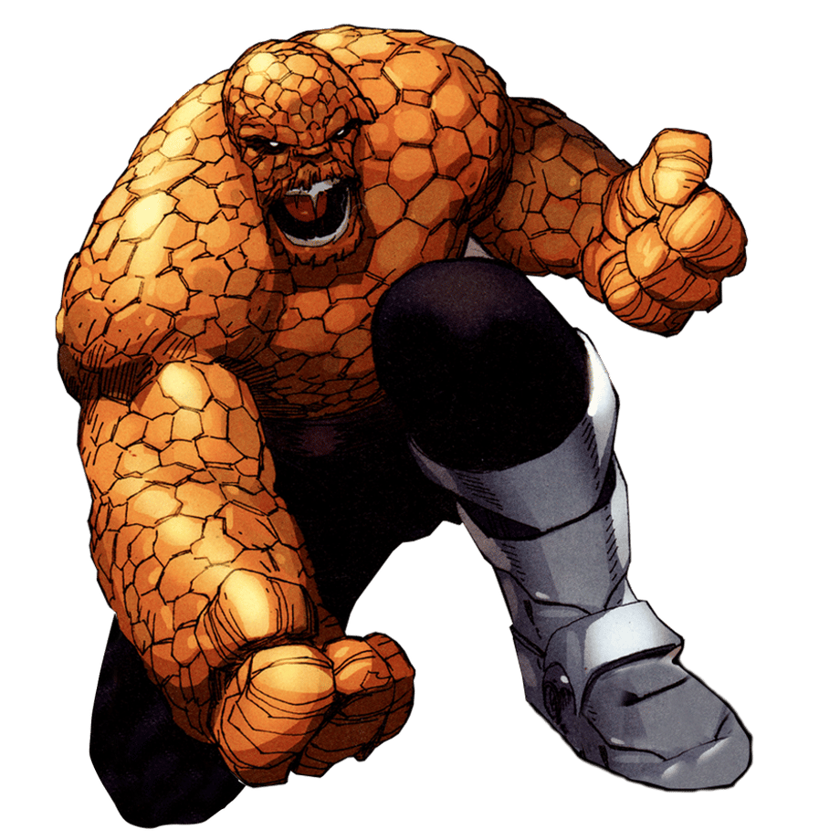 A star football player that jokingly agreed to pilot his best friend's trip to outer space. Exposure to a cosmic explosion made him a rocky, orange giant with incredible strength. Known for his famous yell "It's clobberin' time" which he used in his football games, he brought that aspect of his personality with him while in the Fantastic Four.