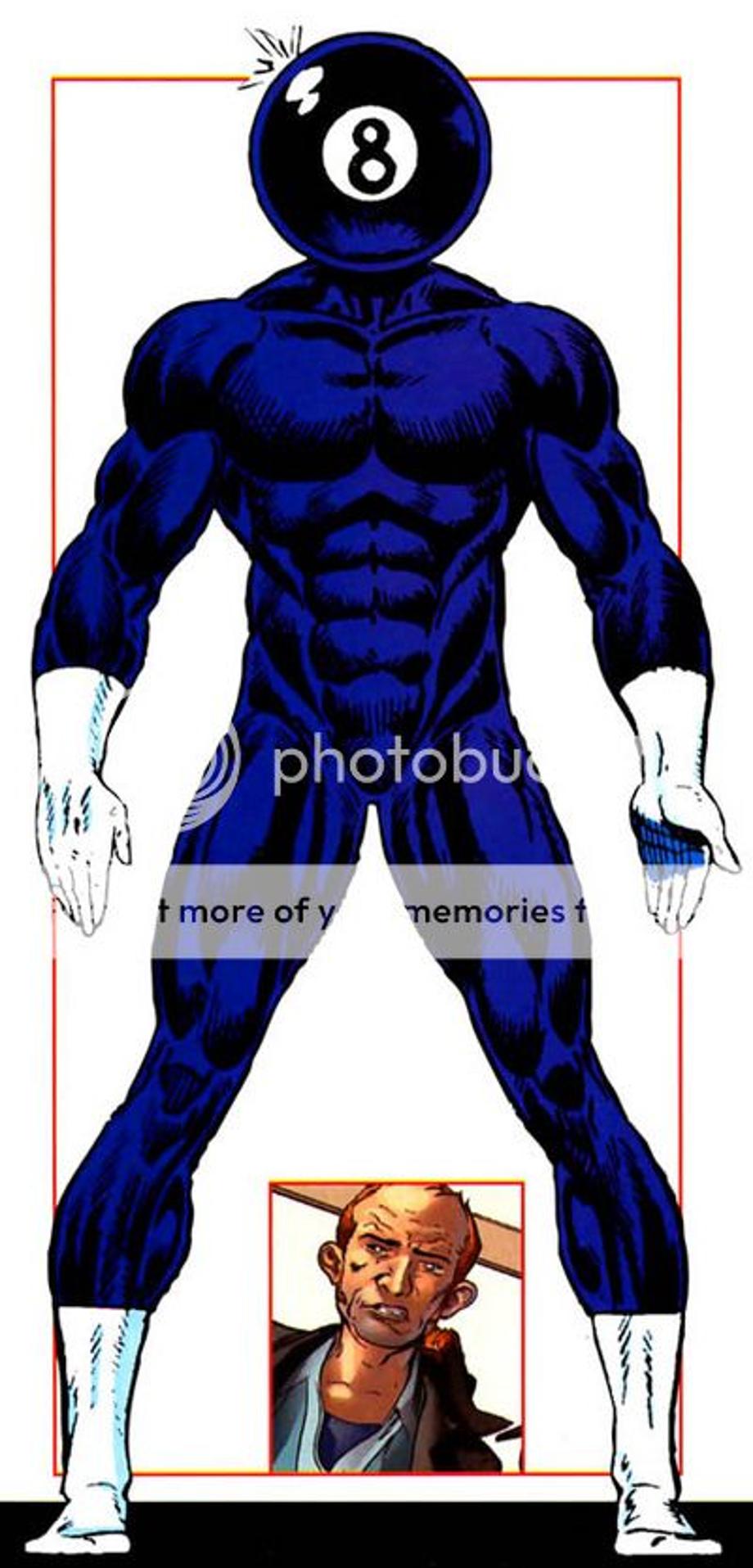 8-Ball is a Fisk Entreprises engineer turned super criminal. Originally a defense contractor who took to playing pool to blow off steam from his job, he incurred a large debt at a casino owned through a Fisk Enterprises shell company. He uses the 8-Ball motif so people let their guard down due to his superficially goofy apperance, while he actually he is a competent and strategic super criminal.