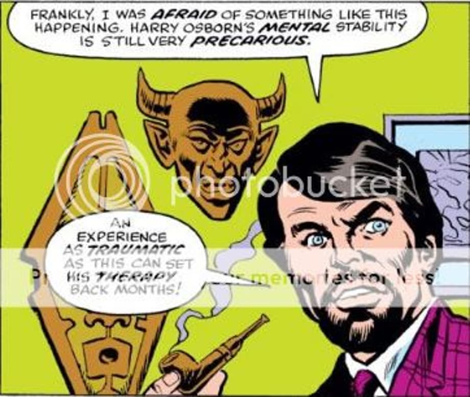 -Gwen continues to be there for Harry, since she and Harry's mother Emily are trying to keep him off the path of revenge against Spider-Man (who he blames for his father's death); he vents his anger to his therapist Bart Hamilton, who, while having Harry under hypnosis, learns the location of a small weapons cache, which he uses to briefly become the new Green Goblin.