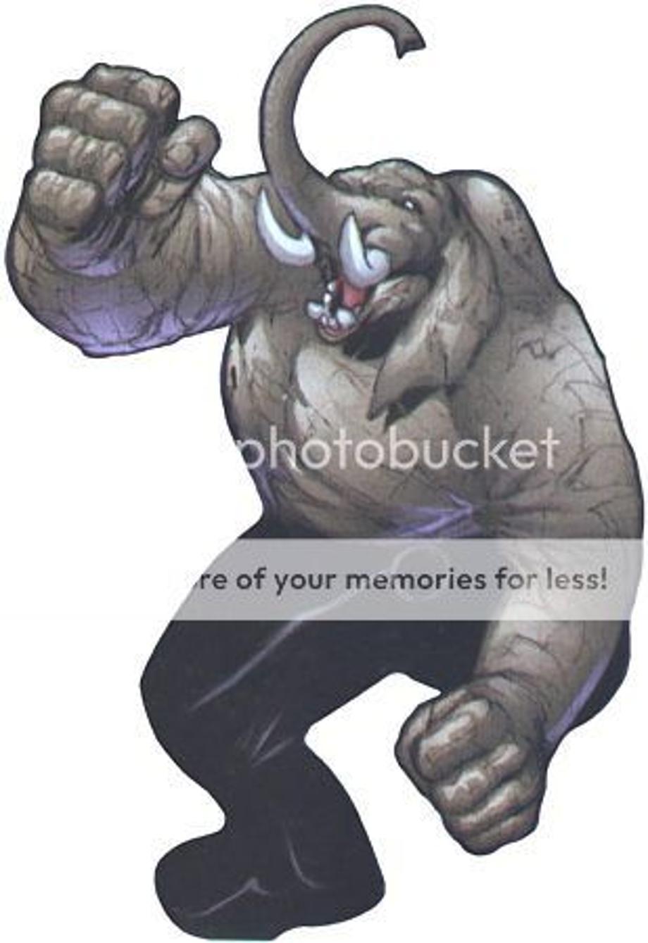 "Very little is known about Elephant Man. It appears that he is simply a large humanoid elephant. Elephant Man joined the Fraternity of Evil alongside Goldilocks, and proved to be a great new addition to the Fraternity, with his incredibly thick hide that is impervious to most damage he can absorb lots of punishment from those who oppose him."