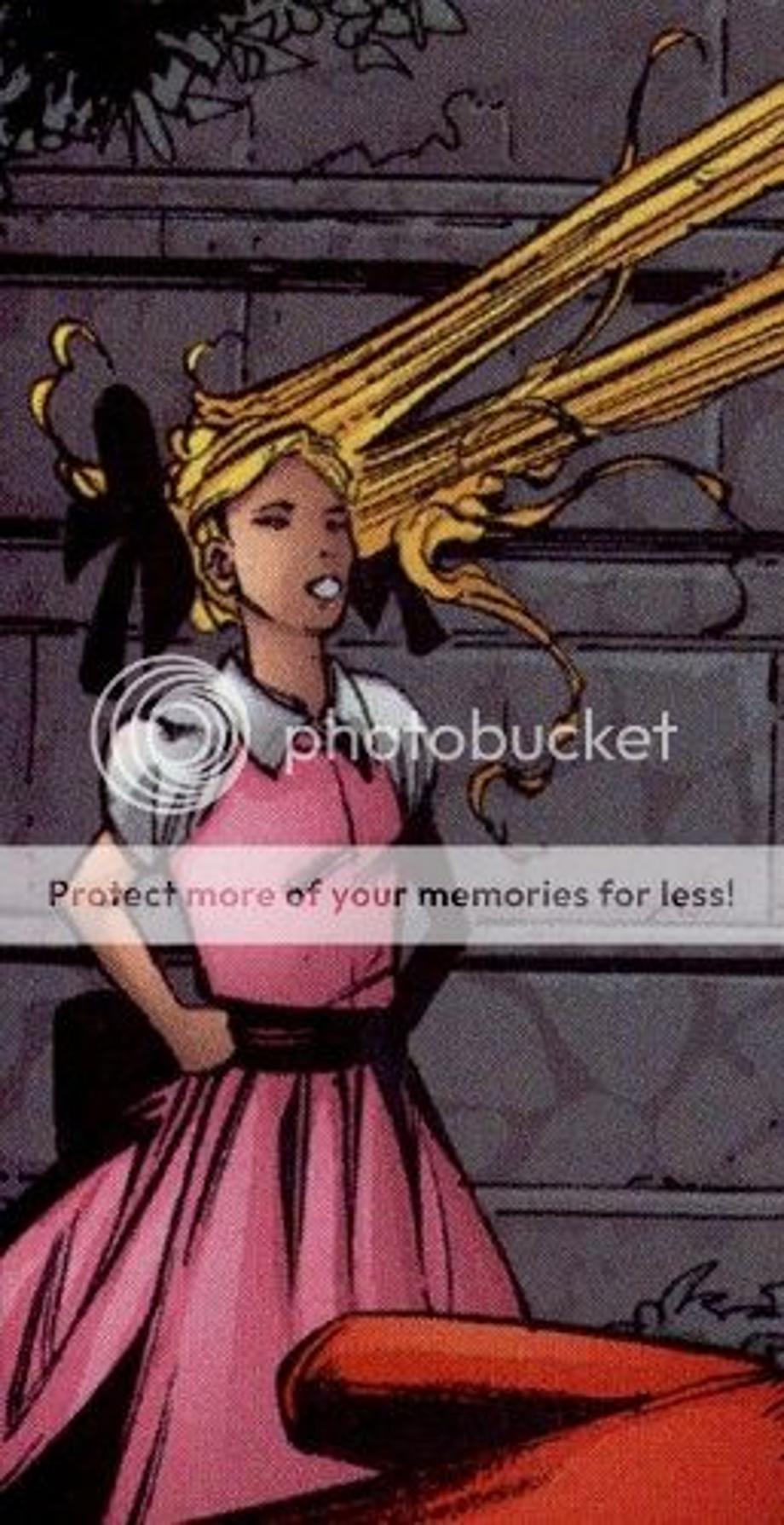 "When The Brain and Monsieur Mallah gathered together a new version of the Fraternity of Evil, Goldilocks is one of its newer members. Goldilocks is a bad seed with a twisted idea of what constitutes a "Happy Ending." Her main power lies in her prehensile hair, which is revealed to be power also possessed by her older sister: Godiva of the U.N.-sponsored superhero team the Global Guardians."