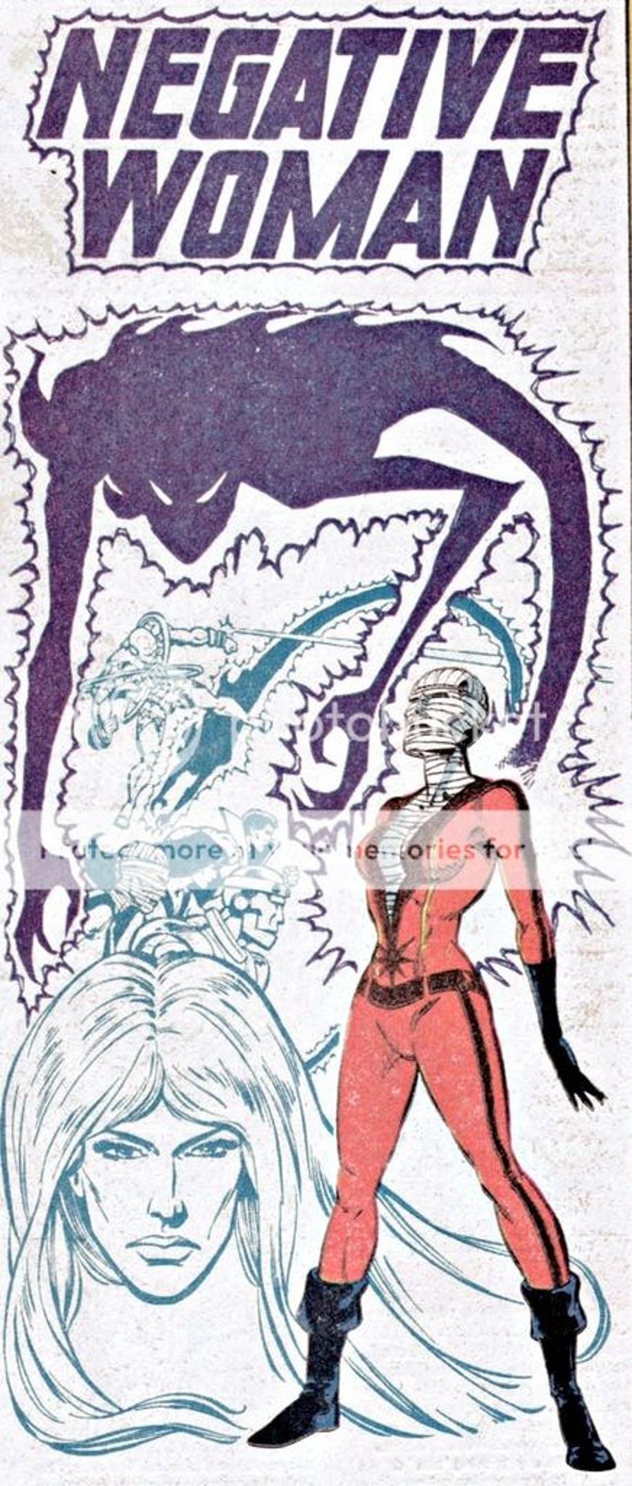 "Lt. Colonel Valentina Vostok, a former member of the Russian Air Force who joined the U.N. Peacekeeping forces, steals an experimental fighter plane in order to provide air support for her unit in a critical mission. The plane malfunctioned en route and she crash-landed at the spot where the original Doom Patrol had apparently perished and was fused with the negative energy being which formerly inhabited the body of the Patrol's Negative Man. However, instead of being able to send it out from her body under her control, Vostok gained the ability to transform herself into such a being. Assuming the name Negative Woman, Valentina defected to the United States and became a member of the second incarnation of Doom Patrol. Valentina became romantically involved with teammate Joshua Clay, aka Tempest, but broke off the relationship due to the nature of her powers changing to match that of her predecessor: her body became permanently radioactive, requiring her to constantly wear radiation-blocking bandages over all of her body, and the radio-energy being would emerge from her under her mental command. Ultimately, when Negative Man was found alive and rescued by the new Doom Patrol, the negative energy split into two halves, and one was returned to Larry."