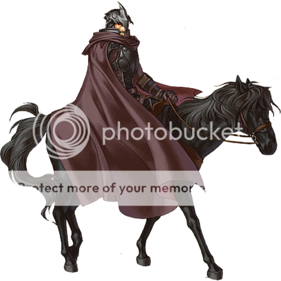 "The Black Knight is the most powerful of Daein's Four Riders. He wore a special suit of full-body black armor that had been blessed by the goddess Ashera, making it impenetrable to all weapons except those that have been divinely blessed, such as Ragnell. He also had access to numerous other arcane items as well, such as the Warp Powder he used to travel, his sword Alondite, and the sword Ragnell, which he gave to Greil seemingly as an act of mercy, although he merely wanted to test his strength against Greil. After killing Greil, he became Ike's mortal enemy, despite Greil's wishes. The Black Knight is defined by his mystery, always appearing encased in full armor, and not going by any formal name. His position as high general in Daein's army was due solely to his immense power and his chivalrous behavior toward Ashnard. When he appears, it is only to do the bidding of his master, and slay anyone who would get in the way. Nobody in Daein's army, not even Ashnard, knows what the Black Knight looks like under his armor. After killing Greil, he realized that it was too easy, as if Greil was holding back. Because of this, he thought he would never be able to surpass his former teacher. The Black Knight spent much of the story aiding Ashnard in his plans, such as providing Ashnard with blessed armor similar to his own. Ultimately, Ike faces off against the Black Knight in a duel at Nados Castle where Ike wins. The Knight is last seen being buried under the rubble of the collapsing castle, his fate unknown until the events of Radiant Dawn."