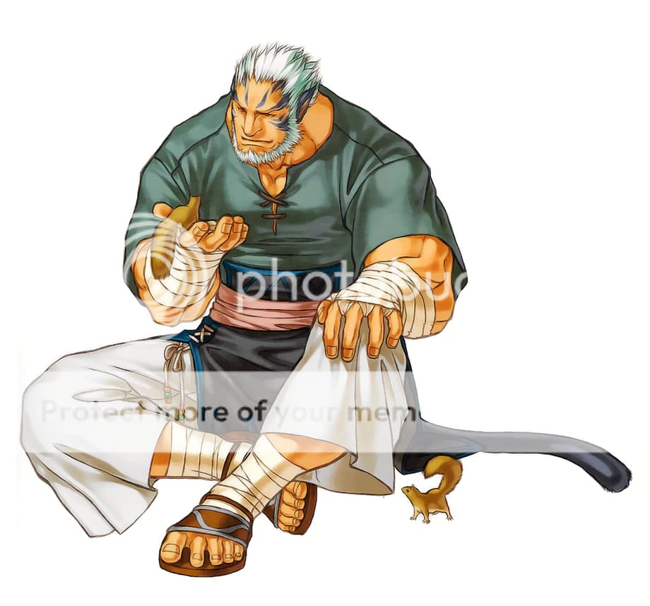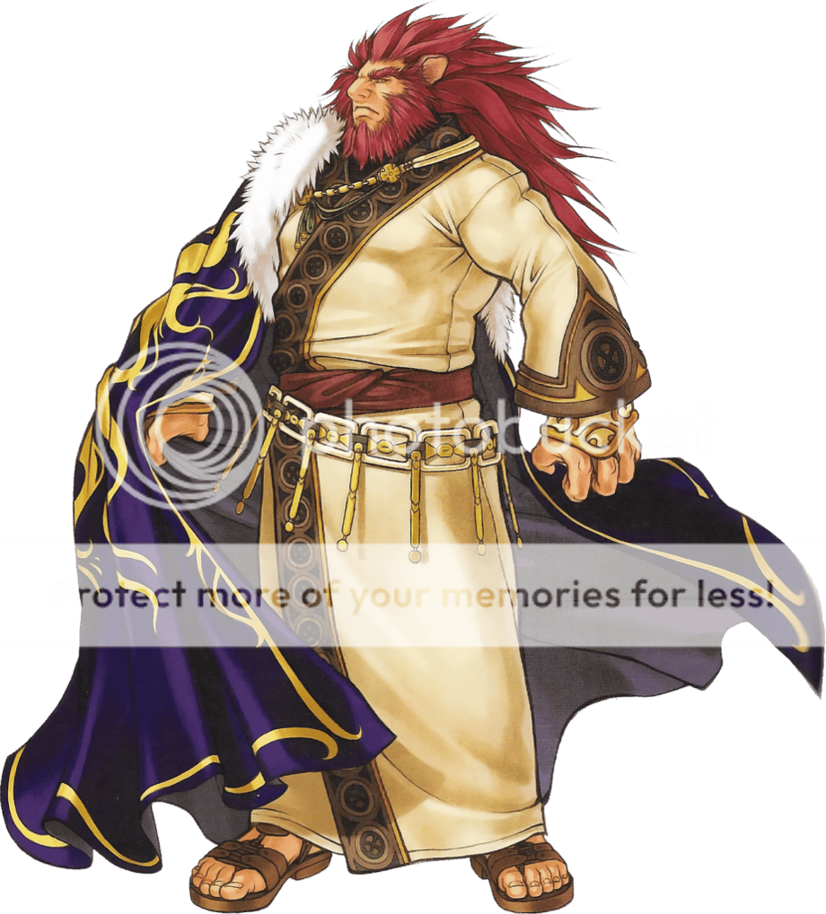 "Caineghis is the valorous king of Gallia, home of the beast tribe and a pivotal laguz nation in the war. Befitting of the name “Lion King”, he is endowed with an impressive physique and nuanced political insight. Wanting to preserve the friendship between the Kingdom of Crimea and Gallia he had fostered during Ramon’s time on the throne, he declared a soldier exchange program. During that time, he met a young Titania. He also employed Greil as a mercenary and found him to be a particularly brave man, which was also how he met Ike. When news of the Daein invasion reached Gallia, Caineghis quickly mobilizes his soldiers, but later laments that he was too late to prevent Greil’s untimely death in battle. After safeguarding Princess Elincia of Crimea, he continues to offer support and manpower as she sets off to the Begnion Empire by sending Lethe and Mordecai with Ike, and later sending Ranulf to help them fight as well. As the King of Gallia and friend of King Ramon of Crimea, he wants nothing more than to see beorc and laguz live together in harmony, although he admits that it is still difficult for him to trust most beorc."