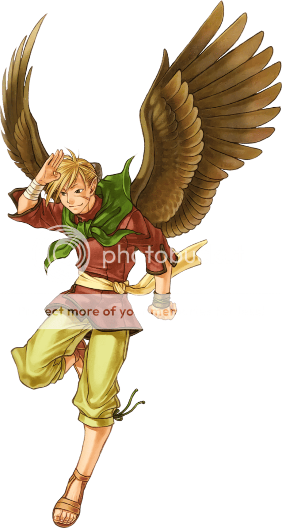 "Janaff is one of Tibarn's right-hand men; due to possessing an impeccable sense of sight, he thus serves as the 'eyes' of the Hawk King Tibarn, often sent out on errands to conduct surveillance on vast areas of land on his master's behalf. Janaff is also a good friend of fellow right-hand Ulki's. Despite being older than Ulki by at least five years, Janaff often behaves like a child. He sports an enthusiastic and friendly personality, a trait that is particularly accentuated when he interacts with other Bird Laguz. Despite his bubbly personality, however, Janaff is easily offended, as can be observed by a support conversation he shares with Oscar, where he responds to the latter's politeness with hostility. Janaff is initially prejudiced towards the Beorc, loathing them for the discrimination they have exhibited towards the laguz race. He later changes this perception of his after remaining in Ike's army for a prolonged period of time."