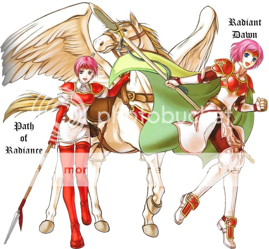 "Marcia is a knight of Begnion, and the younger sister of Makalov. The name of her pegasus is Apples. A former pegasus knight of Begnion’s Holy Guard, Marcia's officially a deserter, having suddenly left the Holy Guard, as she claims, due to her bumbling older brother who worked up a large debt. She is first encountered confronting a group of pirates in her search for her older brother, Makalov in Port Talma. During this time, the pirates refuse to cooperate with her benign request to spare her brother, to which she attempts to fight them off. After Ike speaks to her, she later joins the Greil Mercenaries out of gratitude for Ike saving her. When she reunites with Makalov later on, she is shown to disguise her concern and worry for him under the facade of anger and hatred. Marcia sports a cheerful demeanor, but is known to enter bouts of anger towards her brother and enemies alike. One of Marcia's distinctive traits can be observed in the manner in which she speaks. On various occasions, she is known to use words such as "clambake" and "sponge-brain" as insults. Furthermore, in place of profanities, Marcia will use words such as "crackers", hinting at the possibility of her being rather childish."
