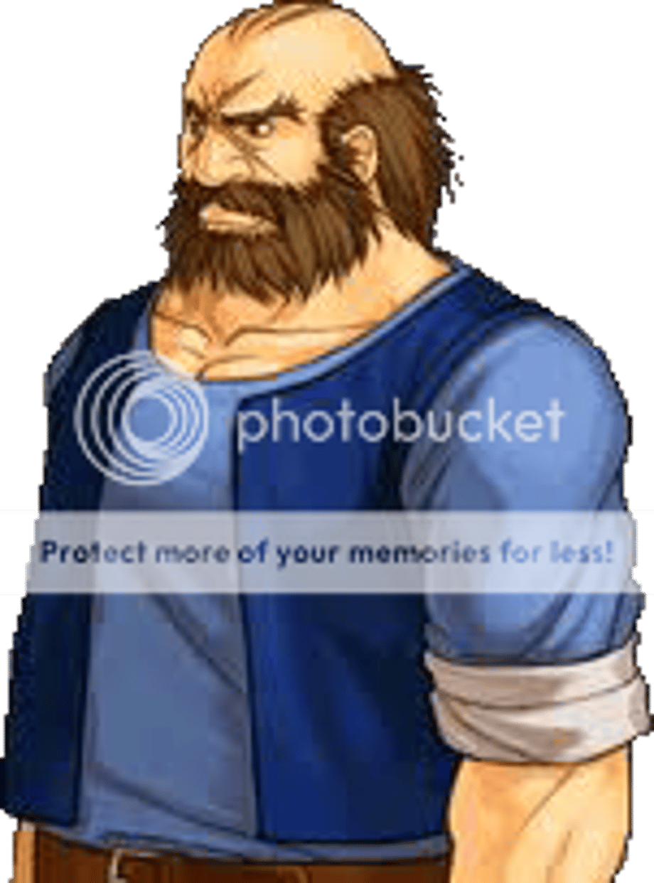 "Brom hails from the farming village of Ohma, which is also the hometown of Nephenee, and lives with a large family that consists of many children. He is first encountered when the Greil Mercenaries invade a jail to free Crimean prisoners of war. Imprisoned in a cell to with Kieran, he expresses terror at the prospect of undergoing torture, alongside a fear that he may never see his family members again. When Ike speaks to Brom after successfully breaking him out of his jail cell, he gratefully gets up to leave with the mercenaries, albeit rather clumsily, as he develops cramps from sitting down on the "hard floor" of his cell for too long. After the mercenaries finally rescue all the prisoners, Brom reveals that he is, alongside Nephenee, a "simple country [militiaman] from the same territory", and has merely joined Ike's forces to prevent his fields from being wrested from his possession. He then resolves to fight for Crimea's freedom in Elincia's name, promising to "send [the] Daein milksops packing". On the whole, Brom is a down-to-earth individual, and likes neither war nor violence. He is also rather sensitive, as can be observed in a conversation with Boyd."