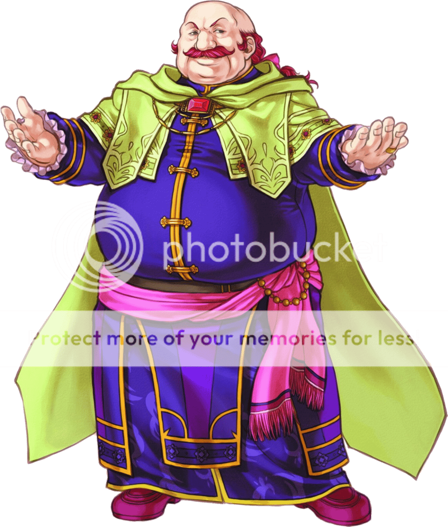 "Oliver is a senior member of the Begnion Senate who was deeply involved in the Laguz slave trade prior to his defeat in Serenes Forest, having purchased Prince Reyson for an exorbitant fee from King Naesala of Kilvas as though he were but another art treasure for his vast collections. With his misplaced vanity, ludicrously inflated ego, and skewed loyalties, he continually throws other characters through loops, often leaving them highly confused or speechless. Oliver is a researcher and self-proclaimed protector of beauty. He has amassed an enormous collection of artistic treasures, the likes of which he appears to believe only himself capable of appreciating. Despite being old, balding and possessing an unsightly amount of weight, he is also quite vain, once commenting that Reyson struck his "beautiful" nose."