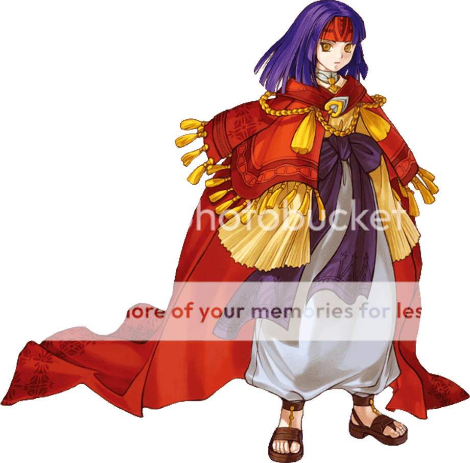 "Sanaki is the empress and Apostle of Begnion. She is actually a young girl that is said to be the vessel of the goddess Ashera. She is a descendant of a long line of Begnion empresses, notably Altina, Meshua, Yoram, and Misaha (her grandmother). After the previous empress' death, Sanaki was backed by the public in the year 640 to become her sucessor despite being just five years old, with the senate appointing senator Sephiran guardian to the young empress. It is later revealed that Sanaki was installed to be no more than a puppet for the senate in order to quell domestic unrest. However, thanks in part to Sephiran, both he and the young empress not only had the public opinion in their favor, but kept the manipulations of the senate at bay. At first, she treats Ike and Elincia coldly and with disdain, but it is in fact a ruse, as she needs Ike's help in uncovering a Laguz slave-trading ring that other Begnion nobles are participating in. After being confronted with the truth around Serenes Forest, Sanaki bowed her head to the herons and begged for forgiveness. Her intentions were deemed genuine enough that even Prince Reyson of Serenes felt his cold feelings toward the beorc lessen. Sanaki is very concerned about manners, and is often put off by Ike's lack of respect in his speech. However, she appears to be very respectful to Laguz, unlike most of the Begnion nobility who disrespect the Laguz and call them sub-human, likely due to being raised by Sephiran, whom she has a very close relationship with. She does occasionally displays an attitude that is appropriate for her age, often acting impulsively and sending those under her servitude into a frenzy."
