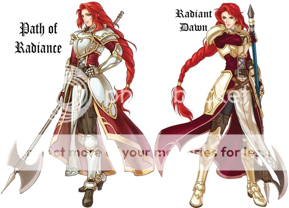 "Sigrun is the commander of Begnion's Holy Guards, and serves directly underneath Apostle Sanaki, the empress of Begnion. In contrast to Tanith, Sigrun is well-loved by her subordinates, since she is kind and compassionate in nature. These traits caused her to give Marcia permission to leave the Holy Guards to search for her missing brother, Makalov. Despite being of noble birth, she does not consider the beorc race to be superior to the laguz race in any way, unlike most Begnion nobles. She is also a skilled warrior for her age, and constantly frets and worries about Sanaki's well-being."