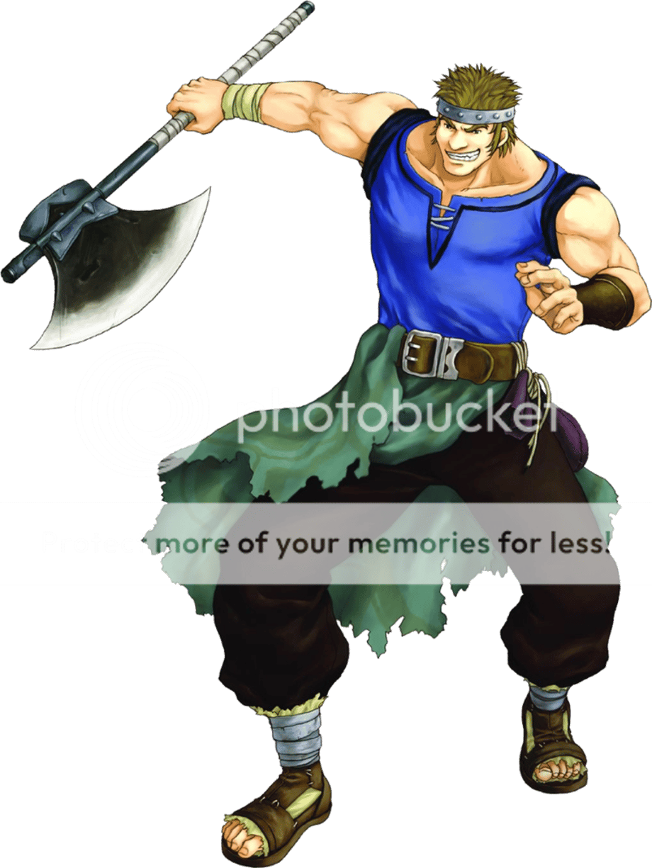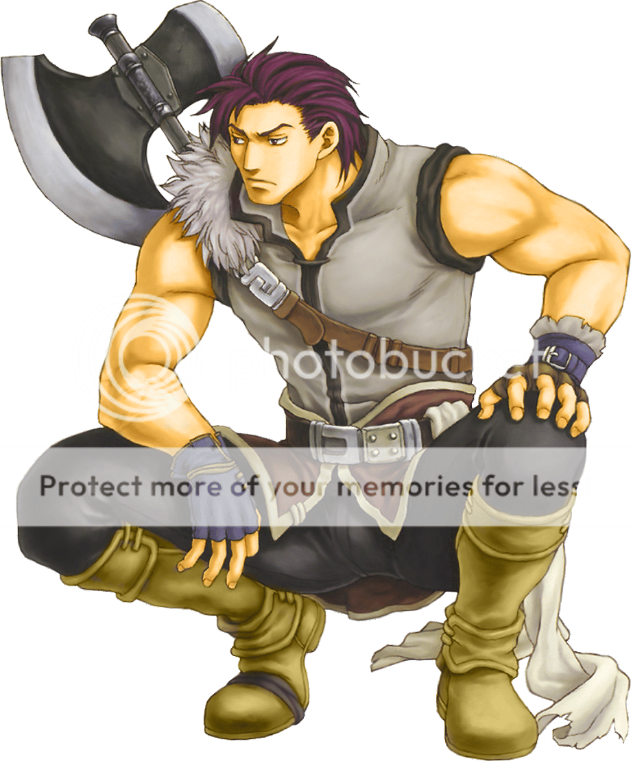 "Hector is a young lord and a good friend of Eliwood. Hector’s parents died of a disease and his older brother, Uther, is the current Marquess of Ostia. He and Eliwood have had a regular sparring match every 2 months since they were 12, with 30 so far. His fighting style is rash and somewhat dangerous as a result of being self-taught in wielding an axe. He is bold by nature, and his straightforward, blunt mannerisms are often a source of consternation among Lycian nobility. Tiring of the inaction on the part of the Lycian nobility against Marquess Laus’s recent suspicious activity, he gathers his axe and sets out on a quest to help Eliwood search for his father Elbert with the assistance of some of his Ostian colleagues, Serra the cleric, Matthew the thief, and Oswin the knight. His personality has a surprising compatibility with Lyn’s and they strike up an unusual friendship ranging from provoking each other to chasing each other on with offhand remarks. This frequently confuses Eliwood, who cannot tell whether they are friends or not. Hector's friendship with Eliwood mostly is a friendly rivalry between the two."