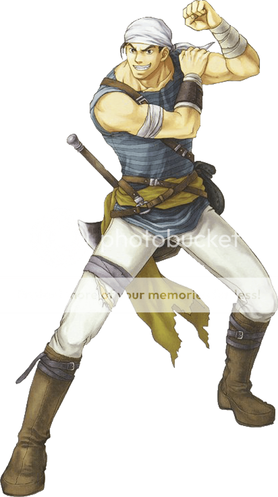 "Guy is a confused swordsman from Sacae's Kutolah tribe who wishes only to be the greatest sword wielder in the world. He will do what he has to do to survive. Three years prior to Eliwood's journey, Guy left Sacae on a journey to become the greatest sword wielder. It is revealed in one of his conversations with Rath that he left due to him not being able to use a bow well nor hunt, but was told by the leader of his tribe that he had a good sword arm. Guy is very jumpy and stutters often. He also looks up to Karel and wishes to become Karel's apprentice so he can become the greatest sword wielder in the world."