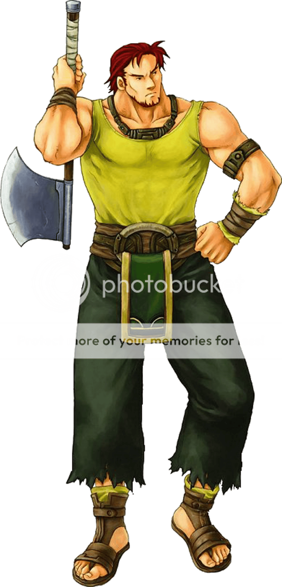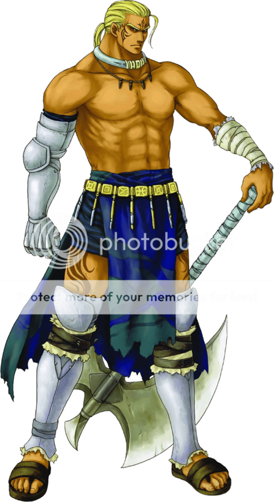 "Bartre is very rash and reckless, but good-hearted. He also shows a lack of education; for example, he says "Hard words make my head hurt!" in a conversation with Canas, and showing Raven a family tree so illegible that Raven could not even read it. Bartre often encourages rigorous exercise, and will encourage people to hit him as hard as they can. During the course of the fight against Nergal, Bartre meets, forms a rivalry, and ends up falling in love with the swordmaster Karla."