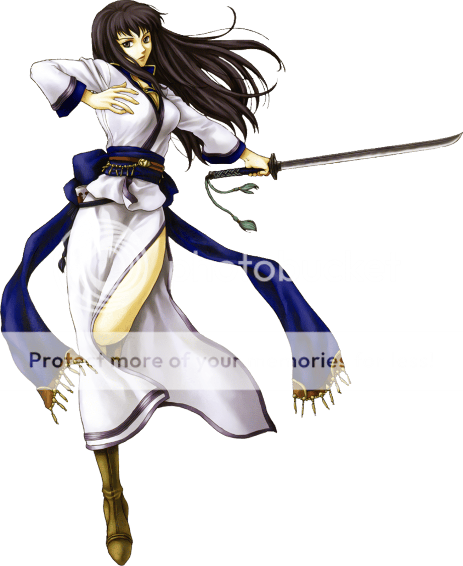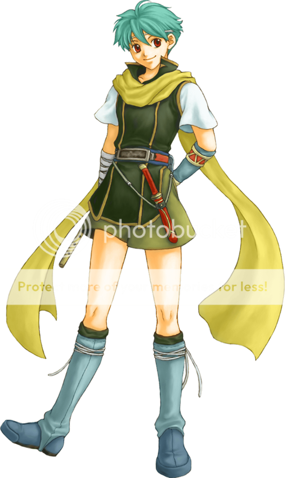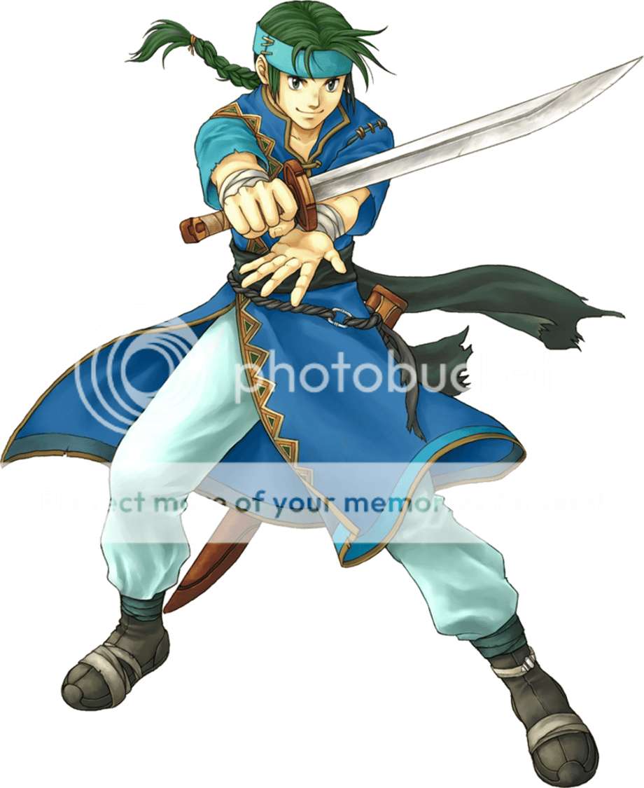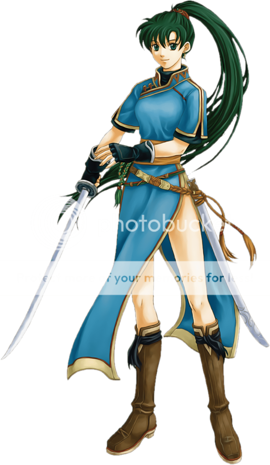 "Lyn was born in the Sacean Plains. Her parents, Hassar, chieftain of the Lorca tribe, and Madelyn, daughter of Lord Hausen of Caelin, were killed by bandits before the beginning of the game. She was named after her maternal grandmother. She lives alone until she finds a tactician lying on the ground. Upon meeting the Tactician, she decides to follow him or her in the interest of training her sword skills and avenge her tribe, who were all killed by bandits. Lyn decides to stop by a nearby town to resupply. She is confronted there by a horde of mercenaries led by the brigand Zugu, but they are disposed of by Lyn with the aid of Sain and Kent, knights of Caelin. They tell her that she is the granddaughter of Lord Hausen, the Marquess of Caelin, who wants to welcome her into his home (something he had refused to do when his daughter Madelyn eloped with a Sacaean “savage”). From her humble origins in the plains, Lyn has been noted as a deep, caring, and kind-hearted soul. She rarely thinks ill of others and, despite the circumstances, always believes on the best of things. However, due to the slaughtering of the Lorca tribe due to the bloodthirsty Taliver Bandits, she has a great hatred toward all bandits and pirates and refuses to be associated with them unless needed to. In fact, the motivation for her travels was to become stronger and kill each and every Taliver Bandit in the mountains in order to avenge her parents. However, she does show mercy to any brigand or pirate that is not a Taliver Bandit, though does not hesitate to defend her friends from them nevertheless. Her serene nature (and the fact that the Saceans "never lie") has earned her the friendship and trust of many of her friends, and the affection of others, including fellow lords Eliwood and Hector, her knight Kent, or a fellow nomad, Rath. Though she seems innocent enough, she will kill anyone that attempts to kill or have any of her friends killed, showing her bravery and devotion toward revenge. Her main weapons of choice are the sacred sword Manni Katti; and its twin the Sol Katti, given to her in the final battle with Nergal."