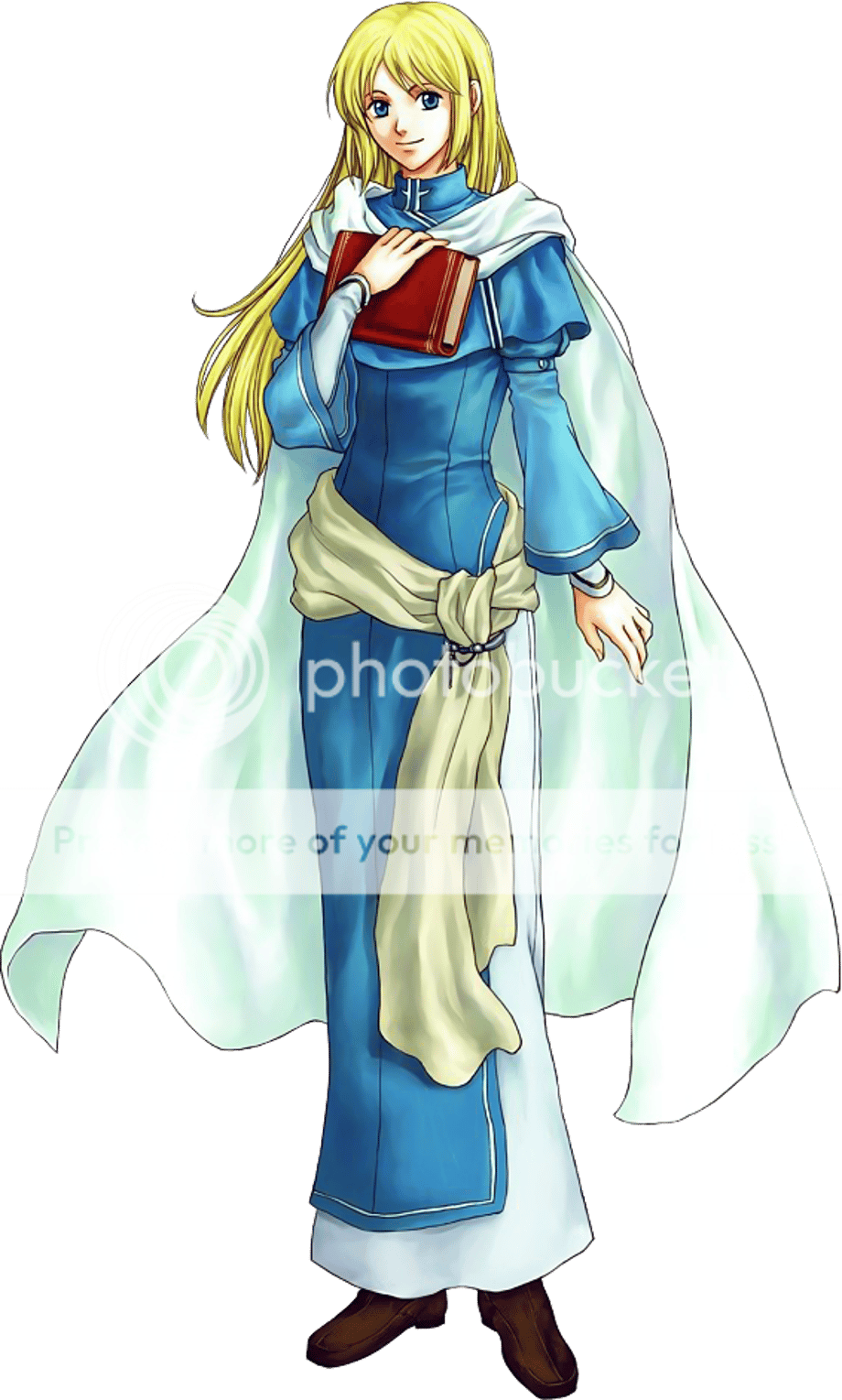 "Priscilla is a troubadour born of the Cornwell house of Ostia, who was adopted by Count Caerleon of Etruria when she was only six years old. In the events following the destruction of House Cornwell by the corruption of Ostia, she was adopted by Count Caerleon of Etruria and lived her life in nobility. She often thought of her older brother, Raymond, who was separated from her in the aftermath of the destruction. Apparently, she was quite oblivious to the details about her origins (likely because of her youth, and it is also possible that the Caerleons hid them from her), but when she heard rumors of the destruction of House Cornwell and the possible survival of her brother, she quickly arranged to set off. Count Pent Reglay of Etruria assigned his pupil, a Mage known as Erk, as her bodyguard. They set off, but were deterred in Laus as the marquess of the land, Lord Darin, learned of her and tried to marry her. After being rejected, Darin, in rage, leaves guards to imprison her in Laus until she agrees to marry him. After a few days of deliberation, Erk leaves the village and travels north to seek aid from other Laus villagers, inadvertently leaving the princess vulnerable to attack from pirates to the east. They are both saved from Erik's cavalry by Eliwood's and Hector's army, which happened to be visiting Laus to confront the marquess about the disappearance of Marquess Pherae, Lord Elbert. Priscilla decides to join their group to keep her protection and to search for her brother. Later, when storming Castle Caelin to rescue Lyn's grandfather, Priscilla encounters a notable Mercenary bearing a great resemblance to herself. With her discovering her long-lost brother, she weeps with joy only to be met with a cold rebuttal from him. His thoughts of not joining the army are quickly evaporated when Raymond learns of one of the Lords in the group, Hector of Ostia. Finding an ample target to exact his revenge on Ostia, Raymond joins, coldly reminding his sister that he is known as Raven now. Priscilla travels with the party for the rest of the journey, helping Raven make amends with his checkered past with Ostia and befriending Raven's retainer Lucius. Priscilla is extremely polite and a bit feminine, as well as selfless, but also naïve and stubborn, much to the chagrin of those who care about her."