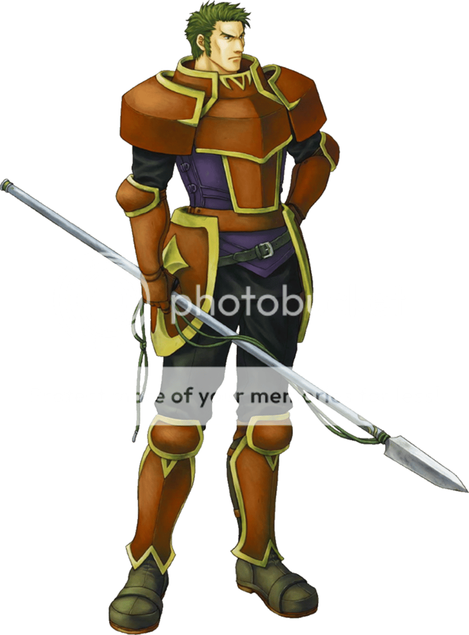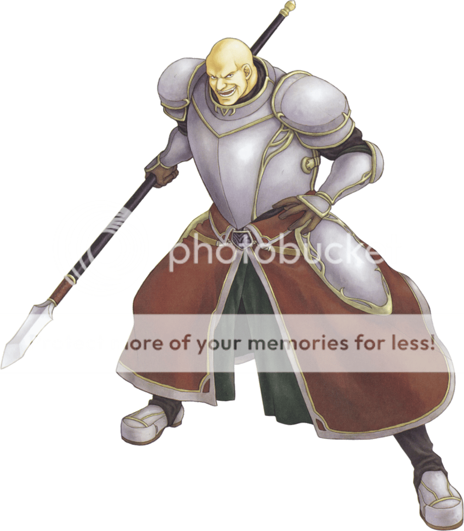 "Wallace was the commander of the knights of Caelin. He later trained young knights, including Kent and Sain. Eventually, he retired and became a farmer. However, when Lundgren rose to power, he ordered Wallace to capture the "impostor" granddaughter and two "disloyal" knights. Upon finding Lyn, he decides to believe her claim based on the look in her eyes. He then joins her and helps her on her journey to defeat Lundgren. After the battle, he searches on for combat, his battle lust renewed, which is sated after joining up with Lyn, Eliwood and Hector during their campaign against Nergal and the Black Fang. Wallace is competitive and battle loving. He seeks out fighting and holds utmost confidence in his skills. He is proud of both his abilities and country to the extent that he seems arrogant. He was a rival to both Hassar and Vaida, and unwilling to yield to the idea that they might be his superior in battle. Yet, Wallace is also warmhearted and loyal. He believes he knows best for people, keeping their best interests at heart, as shown by his obliteration of the Taliver Bandits to prevent Lyn from being twisted by hatred and desire for revenge. However, he can be quite forceful about seeing that what he believes should happen to help someone does, as shown by his forced training of Wil. He appears to be appreciative of those who help him, as shown by his gratitude towards Renault. He also values honor, chivalry, and duty, always placing his lord over himself when he believes it to be in their best interests. He also trusts his instincts, as shown by his choice to believe Lyn based on her eyes."