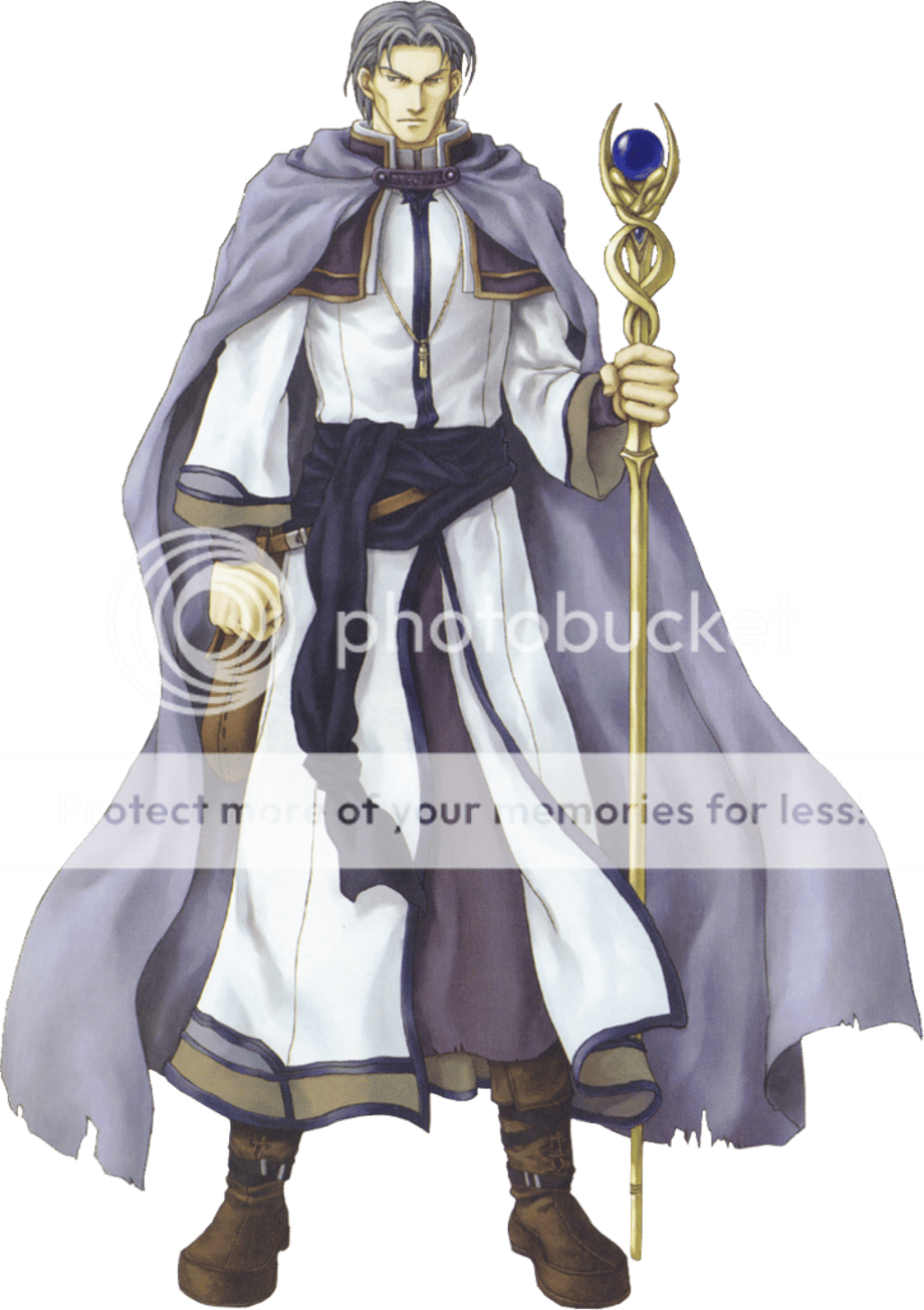 "Lucius was born in Etruria. His father was a famous mercenary for hire, who was killed by a thief in front of Lucius when he was three. His mother eventually died of sickness soon afterwards. As a keepsake, he still has the dagger that his father was stabbed with. Lucius was then taken into an orphanage, where he lived for the rest of his childhood and was often teased for his feminine appearance. He still remembers a teacher from there that was particularly cruel to him. Lucius left the orphanage and began to travel as a monk. He became a retainer to House Cornwell, where he met the Marquess Cornwell's child, Raymond. He served him for more than ten years, before Marquess Cornwell and his wife were assassinated for reasons unknown. The death of Raymond's parents prompted Raymond with feelings of vengeance. Raymond suspected Ostia for the crime, and became a mercenary under the alias 'Raven'. Lucius constantly tried to persuade his lord not to blindly take revenge on Ostia. Lucius is very kind and gentle to the other characters, often expressing the faith of Saint Elimine. He almost never conveys anger towards any of them. This includes aggressive and violent people such as Karel, if he interacts with him in their Support Conversation. Likewise, he tries to help others he deems to be suffering, and sometimes at the expense of his own health; Lucius suffers from a spiritual illness, which afflicts him when he offers relief to people that are emotionally tormented. This makes Raven no exception, who Lucius tries to turn away from blindly taking revenge on Ostia for the destruction of House Cornwell. Lucius' tenderness also seems to extend to those who have also caused him grief. He is quick to forgive Renault for the murder of his father, and empathizes with his regret. However, Lucius can also be very outspoken and stubborn. He refuses to withdraw when Raven tells him to stop following him and leave the battlefield. Similarly, he does not stop to badger his friend about his grudge against Ostia."