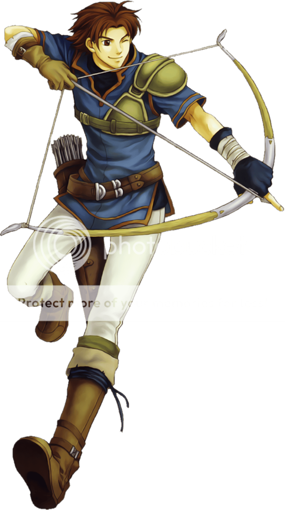 "Not much is known of Wil when he lived in Pherae with his friends Rebecca and her brother Dan, although one time the two considered being mercenaries, and eventually he and Dan went to fulfill their dream, setting off and leaving a heartbroken Rebecca behind. They traveled for about a month before Dan got homesick and split up with Wil. Left astray in Badon, the archer wandered aimlessly before arriving in a village in the Taliver Mountains, being attacked by the bandits of the region. A cry calls out asking who lives in the village, and Wil answers it, coincidentally meeting Lyn and her troop. Learning of their battle with the bandits, Wil joins up with the group and fights them off, then joins them as he had no where else to go. Wil aids Lyn in her battle against Lundgren, then becomes a soldier of Caelin. A year later, Wil is one of the few survivors of Caelin’s occupying garrison, along with Kent, Sain, and Florina, driven out by Darin’s forces when they laid siege to Caelin. Eliwood and Hector arrive timely, and together they retake Castle Caelin. Wil then travels with the group as they quest to defeat Nergal and his Morphs."