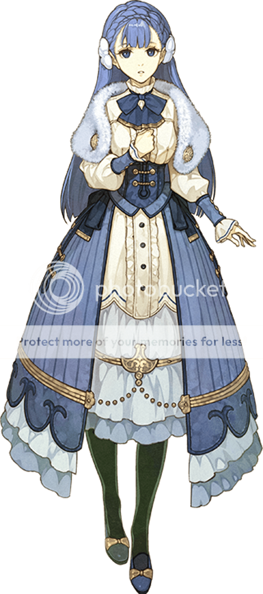 "Rinea is a noblewoman from an impoverished Rigelian house and is engaged to Berkut. Even within the Empire, she is renowned for her beauty, and the one person whom Berkut trusts without reserve. Rinea met Berkut at a royal ball. Despite the lesser nature of her noble house, Berkut was charmed by her beauty and offered to dance with her, thus beginning their romance. Throughout the war, Rinea shows no interest in battle as she detests violence. While uncomfortable around most strangers, Rinea still tries to put up a pleasant and polite front. She seems to feel a lot of pressure to be an "acceptable" fiancee to Berkut, even though she dislikes public life. She often frets a lot about her choice of words and being what is considered appropriate in her department. Being the daughter of a minor Rigelian noble family that is not well-off, financially or in social standing, her discomfort with court life is exacerbated. She does, however, love to dance, and also enjoys nature and being outdoors. While typically fairly soft-spoken, if Rinea has an opportunity to talk about something she likes, she will become much more animated and verbose, a trait she is rather ashamed of.