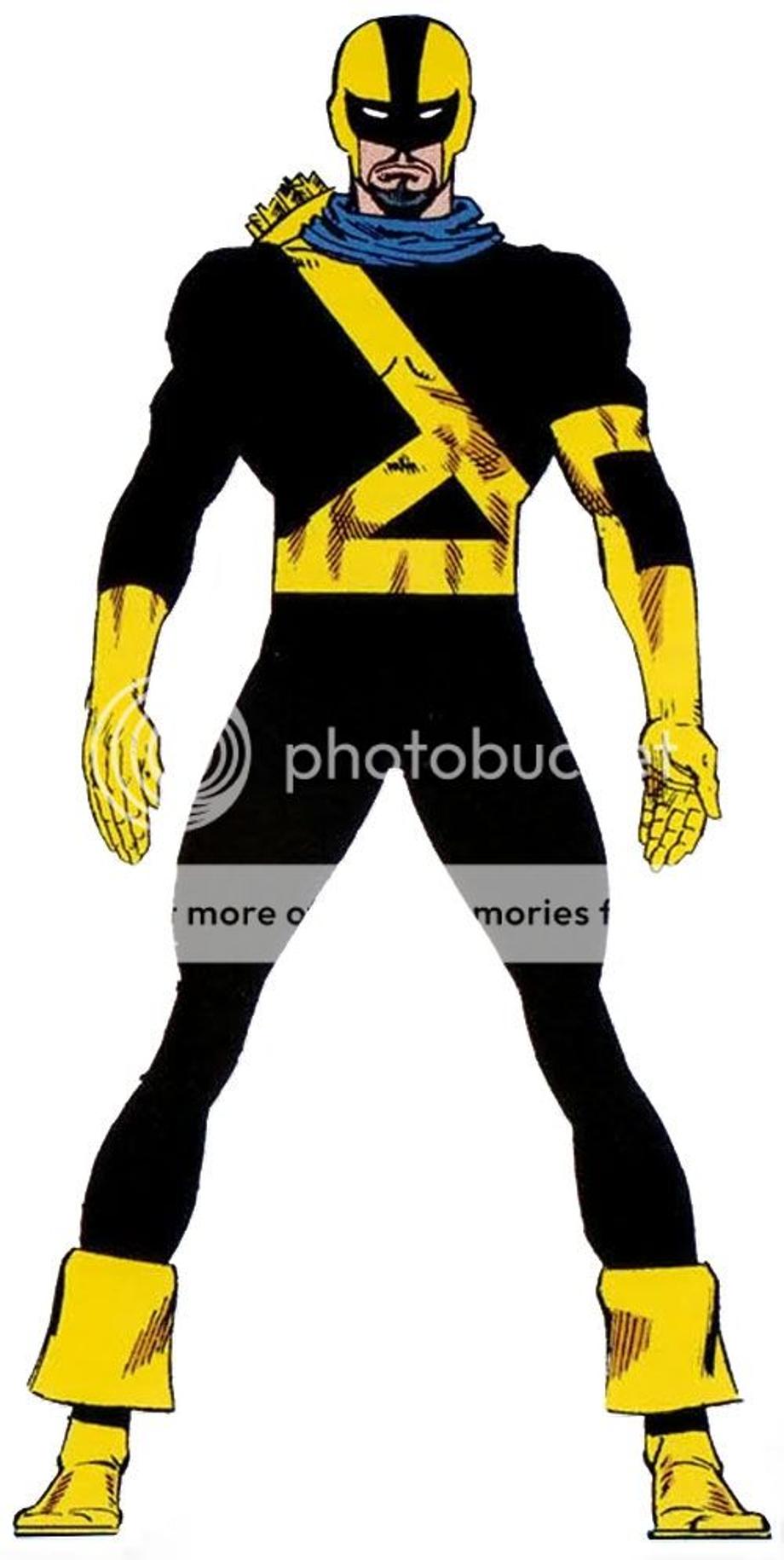 A British cab driver who became a highly-skilled archery expert, McDonald (first under the name Hawkeye and then Golden Archer) fought crime alongside his teammate and on-again-off-again lover Lady Lark in the city of New Babylon. They eventually garnered enough renknown to join the Squadron Supreme. During the early days of the Utopia Program, a mission to dismantle an arms plant nearly proved fatal for Golden Archer when a rebel nearly killed him after his force-field belt shorted out, only for him to be saved by the Whizzer. This brush with death got Wyatt thinking about how he wasn't going to live forever, and so he decided to ask Lady Lark to marry him, since they had been dating for several years now. Unfortunately, Lady Lark had started to develop a crush on fellow teammate Blue Eagle, and was also well aware of the fact that could she lose her powers (which she looked at as a curse), so Wyatt wouldn't be able to connect with her. Therefore, when the Golden Archer did ask her to marry him, she rejected him kindly but firmly. In his rage, and unable to accept that Lady Lark was starting to move on, the Archer used Tom Thumb's recently developed 'B-Modding' treatment to brainwash Lark into loving him. However, a side effect of the B-Modding that Wyatt hadn't counted on was that Lady Lark now loved him too much--she refused to leave his side and wouldn't give him any space. To get away from her and perhaps think about his rash actions, the Golden Archer ran away from the Squadron without telling anyone. Unfortunately, this in turn led to the Institute of Evil, the Squadron's opposite numbers, capturing the Archer. After severely injuring him, the Institute found out about the B-Modder, as well as the location of the Squadron's headquarters, from the Archer, and used the information to seemingly B-Mod the Squadron. Luckily for the Squadron, it turned out that Tom Thumb had guessed that Wyatt had used the B-Modder on Lady Lark, and afterwards had built in failsafes to prevent the B-Modder from altering any members of the Squadron Surpeme. The Squadron were able to defeat the Institute of Evil, and Wyatt was lucky enough that Tom Thumb didn't reveal his suspicions.