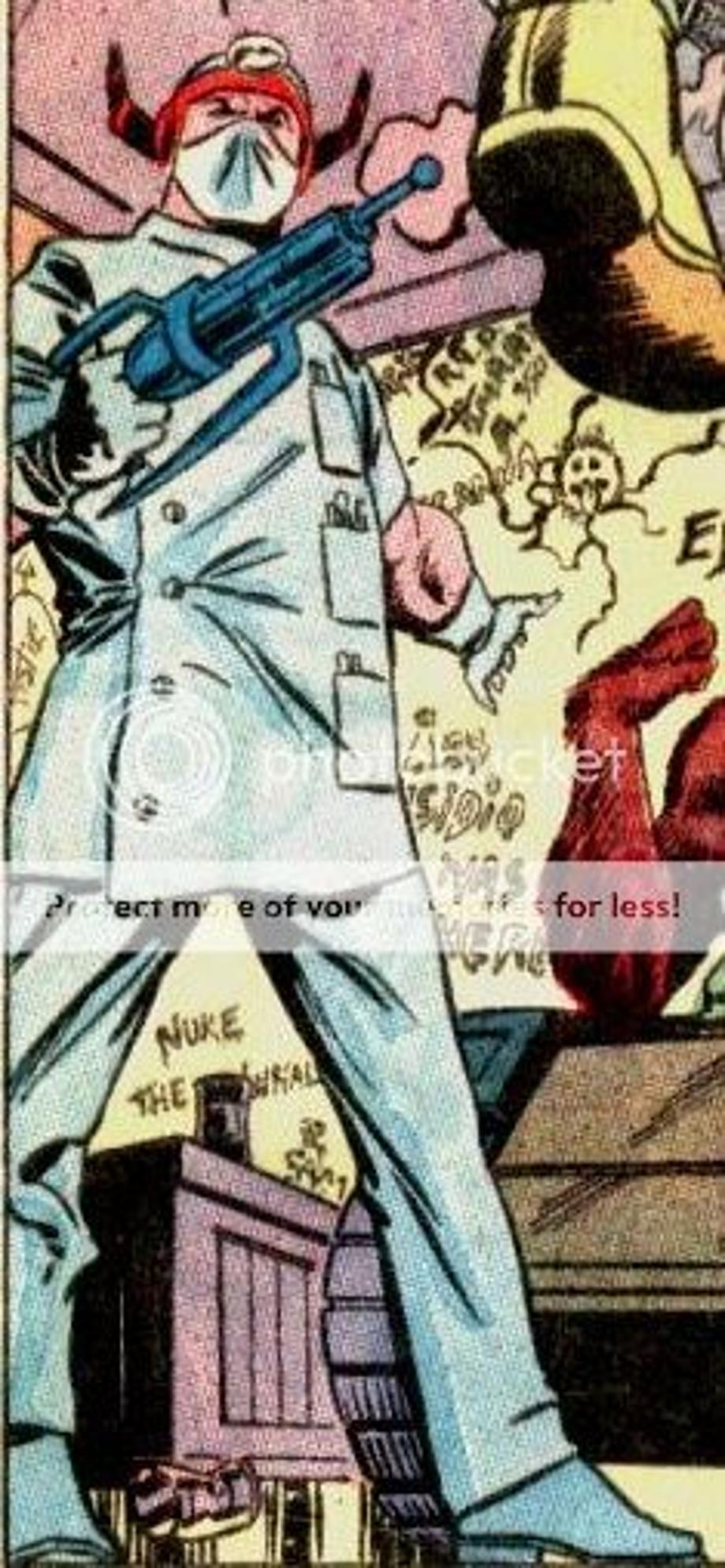 An ordinary worker at a nuclear power plant, Albert Gaines was accidentally exposed to nuclear waste products, and in the most unlikely of origins, gained superhuman powers as a result. Sometime prior to the Squadron Supreme being controlled by Overmind and Null the Living Darkness, Albert was asked to join the Squadron, and happily accepted. For unknown reasons, he chose to keep his identity secret from the rest of his family. Nuke was shown to be very caring of his family, and wasn't shown to speak up much when in the Squadron, highly likely due to depression from his parents' illnesses. However, Nuke was shown to have a near-unstoppable rage when something could provoke his anger. Nuke would later discover that his own powers had given his parents their cancer, and turned to Tom Thumb for help. Upon Tom admitting that he hadn't found a cure for cancer, Nuke snapped, and started shouting threats at Tom, even though Tom had tried his best to help Nuke. He also got into a violent fight with Doctor Spectrum, which only ended when Spectrum accidentally killed Nuke. Doctor Spectrum later visited Nuke's younger brother Scott, who he apologized to for his actions.