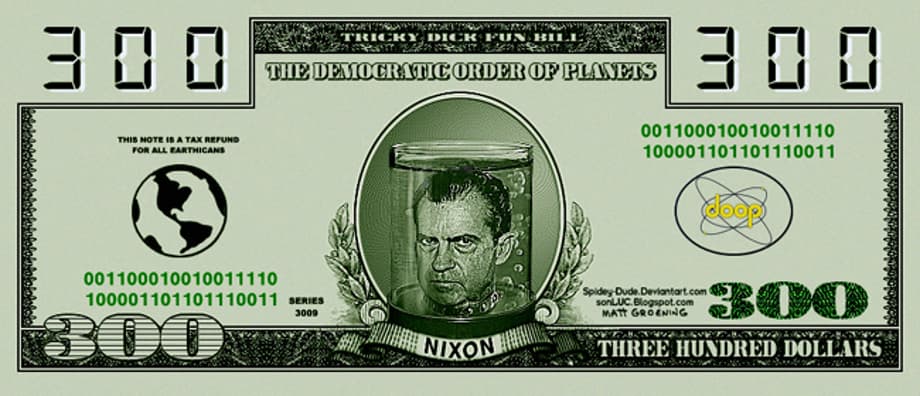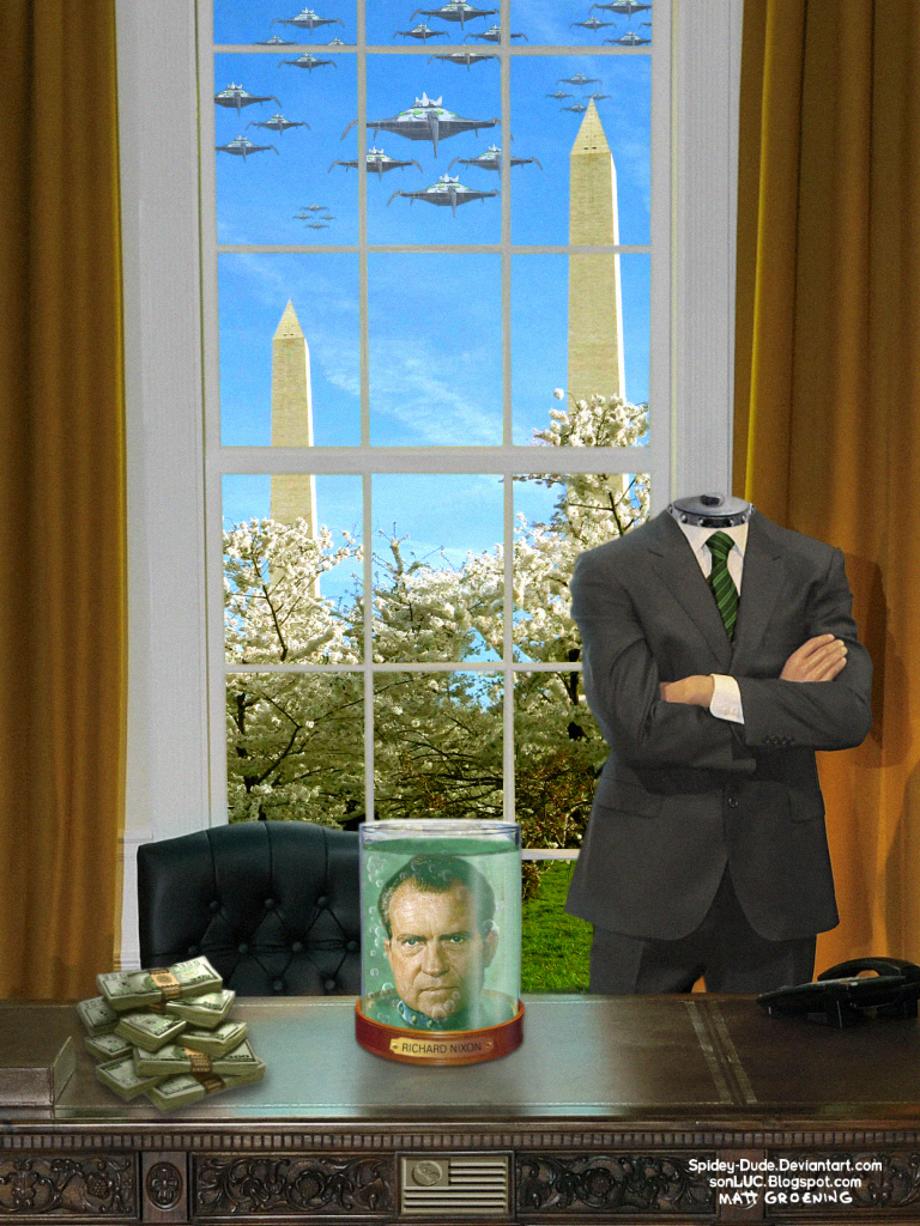First up is a manip of Richard M. Nixon's head. I created the Nixon Head Jar by using parts of a fish tank and a glass of water. For the background we used a pic of Obama and I took off his head to make The Headless Body Of Spiro Agnew. Then sonLUC complied all of it together by adding the Omicronian Spaceships and the $300 Trick Dick Fun Bills. No casting here really, for a film I would suggest a cgi head with voice done by the same guy who voices him in the show