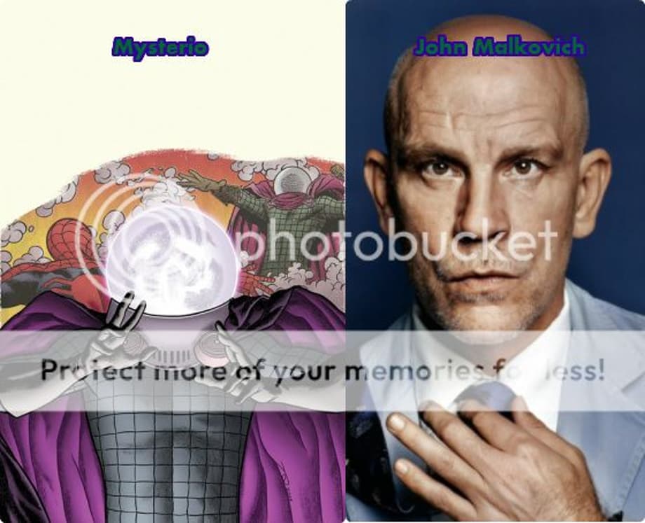 Malkovich would be my top pick for Mysterio because of the ridiculous amount of fear and overall presence he can bring. He's a smart actor though which I think suits Mysterio along with the way he can play a villain. I think of Mysterio as a cross between his character in RED and his role as Cryus the Virus in Con Air.