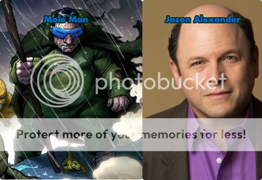 Jason Alexander is the perfect person to play Mole Man becuase not only is he quite a short individual, and looks eerily like MM but he also can be such a little weird creep. Jason is actually a very funny individual (I know many people personally who didn't like George Costanza) and could bring a little humor to a weird character like Mole Man.