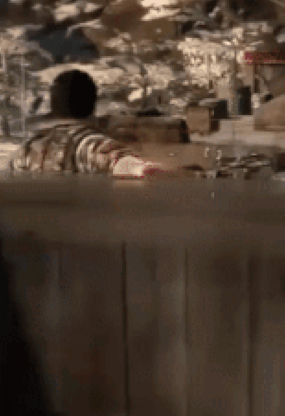 Barney watches his brother’s efforts, he tips red liquid from the stolen vial on an arrow. He strings the arrow on bowstring. The boy aims straight in his father. He raises the hand higher. He’s waiting.