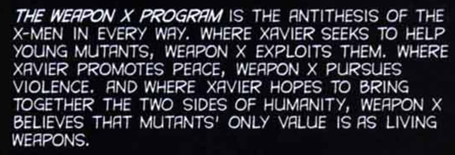 Weapon X is an program long created, a secretive government program, made by Bolivar Trask along other scientist and rebelled shield colonels, the weapon x is the antithesis of the x-men, where Xavier seeks to help young mutant, the weapon x instead exploit mutant and brainwashes them to turn them into assassins, while Xavier seeks peace and harmony between human and mutants, Weapon x hold the symbol that mutant are only living weapon needs to be used.