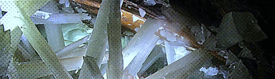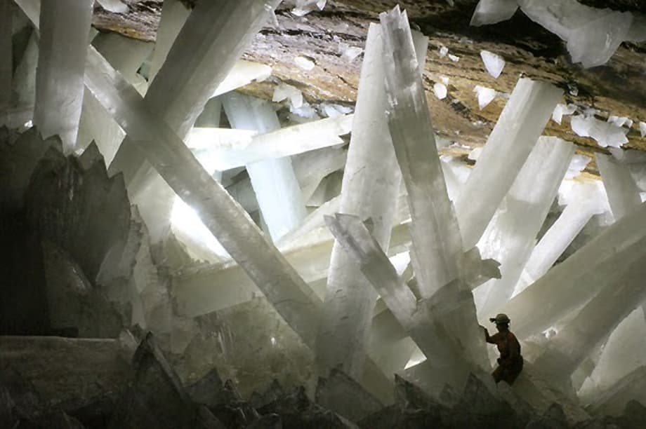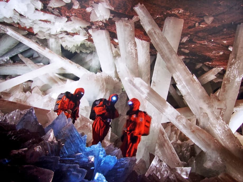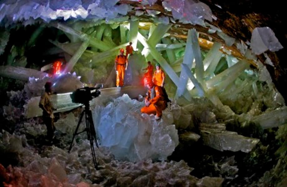 The explorers reach a terminal room- "Hazmats, everyone." -and begin to lace themselves in padded suits before entering the main chamber, "Here it is, the main event, a giant mineral deposit super-structure, the largest natural crystal formation ever found on Earth!" The crew hesitates to take the first step, Elder goes first. "Careful now, watch your step." They begin to trudge down the inclined gorge and position lighting fixtures all around the edge of the limestone cavity, its floor is covered with perfectly faceted crystalline blocks, "Gorgeous." "Eyes down, Alyssa." The brunette girl yelps then catches her a balance, "Slippery." "And razor sharp. Keep your head, Dr. Moy, you're going to need it." They stumble along the rugged surface well aware of the falling hazard, huge crystal beams tower over them, some equal in girth to that of an American sports car, and jut out sporadically from both the razor sharp blocks below and the quartz-laden ceiling above, and as the growing number of lighting apparati starts to brighten up these transluscent pillars, the whole place lights up Vegas, though someone of a nerdier persuasion could also be reminded of Superman's Fortress of Solitude. A stunning discovery— but it's not their discovery, nor is this the reason these scientists were summoned to the underground kingdom in the first place. Since this sequence is edited like some sort of basic cable UFO documentary, a montage of accompanying imagery gets the viewers caught up on the goings-on of this world, while Harvey Elder narrates.