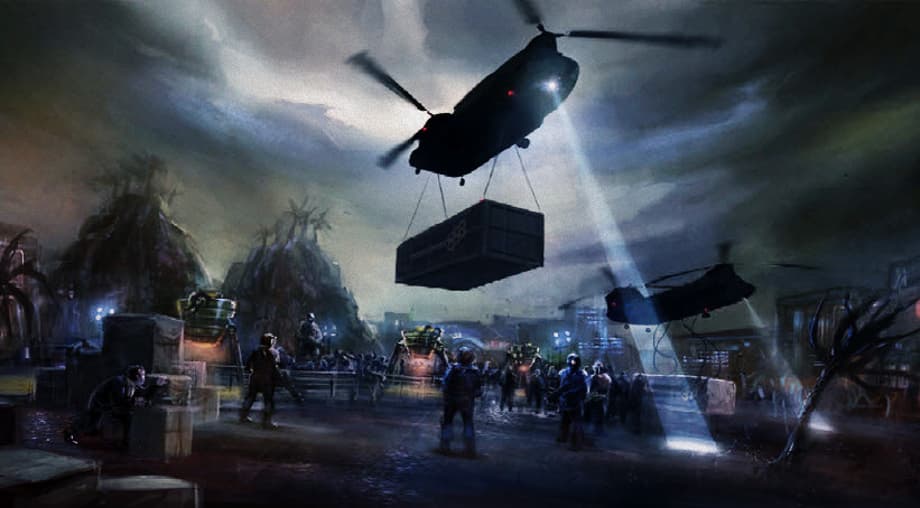 Chapter Zero — The titular "zone" is the opening shot of the film, an ASTEROID BELT occupies the foreground while vibrant planets and strange celestial bodies eclipse behind it. The largest rock in this belt has a space station built into the side of it, THE GIDEON TRUST, a deep space mining venture set up by one of Earth's billionaires. We switch locations to The Trust's interior, lights are flickering, alarms are blaring, Abramsian visual debris fills up the screen, and the film itself cuts out completely every so often adding extra freneticism to the sequence. Bodies of nameless personel are strewn about the floor, the alarms indicate an evacuation, clearly something alien just breached the station moments ago, and everyone comprising the frightened mass sprinting down the main service corridor is wearing a labcoat. Separately, a team of ENGINEERS fire up improvised mining tools, suspensfully awaiting an invasion within their metal-grated engine room— ALIEN INSECTS breach the room in an overwhelming volume. Two men lead the labcoats into a room labeled EVAC STATION, narrowly escaping the swarm. "They came from engineering, that entire deck got flooded with those things! That means hull decompression, and... human casualties, and I'm responsible." "Don't say that. We'll count heads once the lifepods splashdown." Franklin Storm (Viggo Mortensen) carries a limping scientist into an escape pod while Gregory Gideon (Herbie Hancock) sets the coordinates for Earth. "Remind us again where that would be?" "New York, Franklin. On the Hudson. Ball's in your court now, that building of yours is now our safest haven." Franklin ejects one last pod full of scientists out into space, an exterior shot of The Trust shows the capsule disappear into a self-imposed space rupture, sending it back to our dimension, as the planet this station is orbiting is one you would neither recognize, nor wish to find yourself stranded upon.