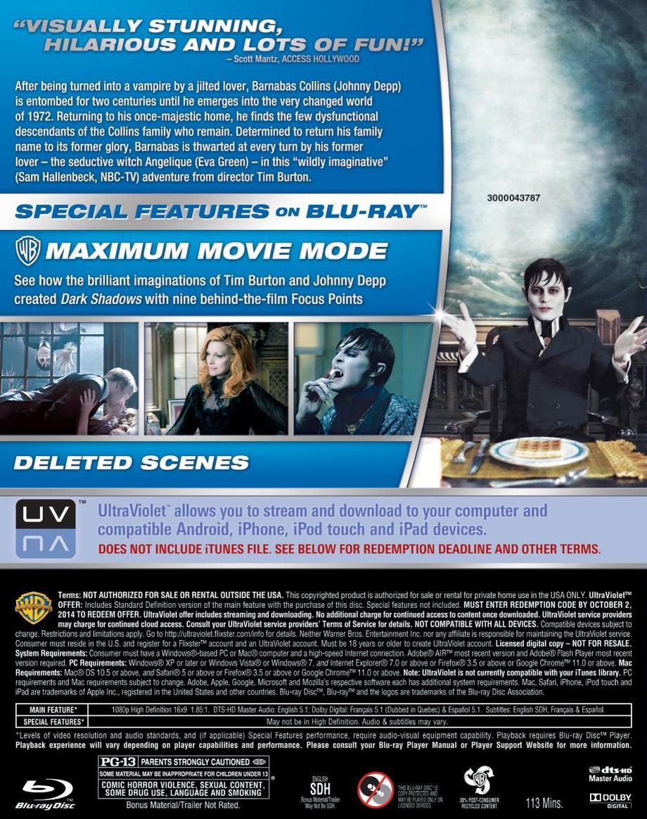 Thanks to Blu-Ray.com, we have the full Blu-Ray details for Tim Burton's latest collaboration with Johnny Deep, Dark Shadows. Set to release October 2nd in the US, this set comes with several deleted scenes and the Maximum Movie Mode feature that is usually included on many Warner Bros. Blu-Rays. Check out all down below!