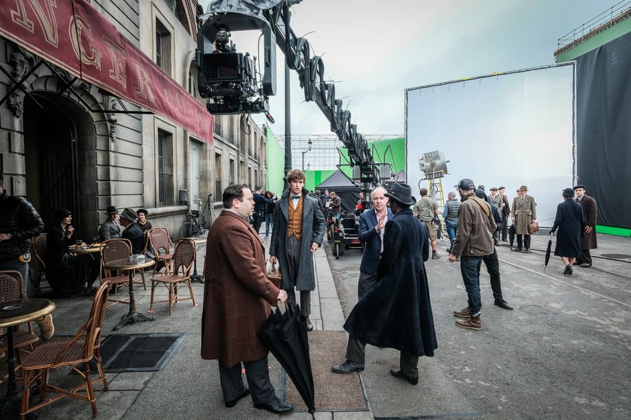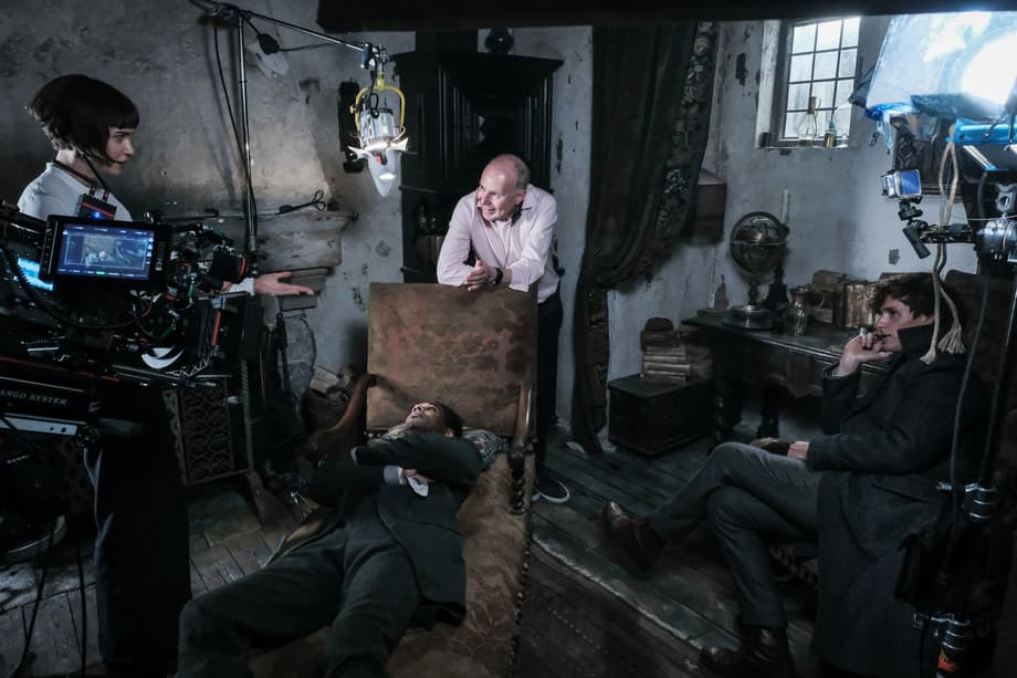 (L-R) KATHERINE WATERSTON, director DAVID YATES and EDDIE REDMAYNE behind the scenes on Warner Bros. Pictures' fantasy adventure "FANTASTIC BEASTS: THE CRIMES OF GRINDELWALD,” a Warner Bros. Pictures release.