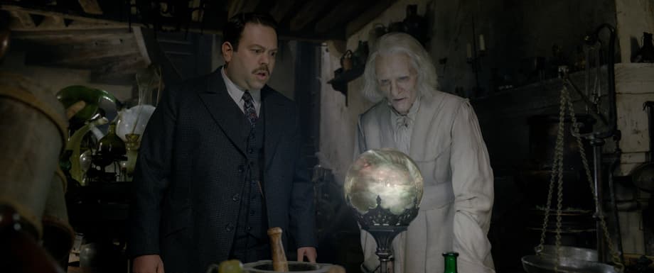 (L-R) DAN FOGLER as Jacob Kowalski and BRONTIS JODOROWSKY as Nicolas Flamel in Warner Bros. Pictures' fantasy adventure "FANTASTIC BEASTS: THE CRIMES OF GRINDELWALD,” a Warner Bros. Pictures release.