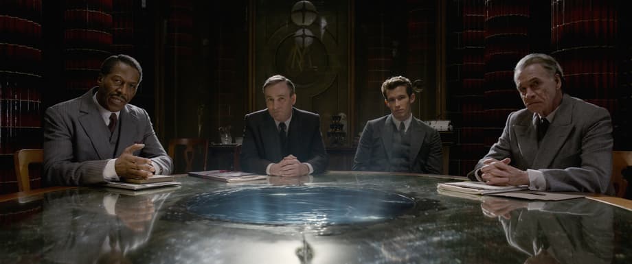 (L-R) CORNELL S. JOHN as Arnold Guzman, DEREK RIDDELL as Torquil Travers, CALLUM TURNER as Theseus Scamander and WOLF ROTH as Spielman in Warner Bros. Pictures' fantasy adventure "FANTASTIC BEASTS: THE CRIMES OF GRINDELWALD,” a Warner Bros. Pictures release.