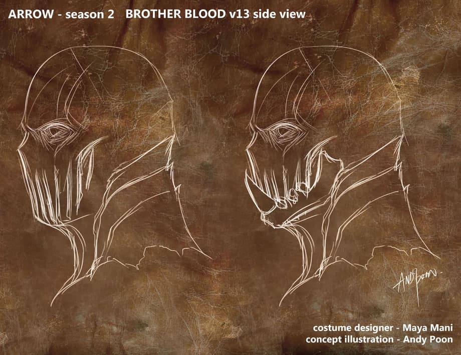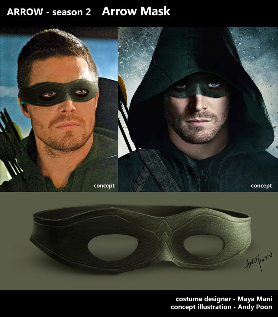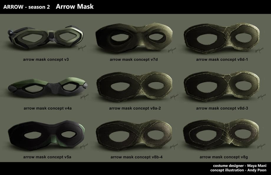 Alternate mask designs for Oliver Queen and Brother Blood, created by conceptual illustrator, Andy Poon. Plus, costume illustrator, Christian Cordella ("Iron Man 2"), released his artwork for Oliver's superhero and survival costumes. Come check them out!