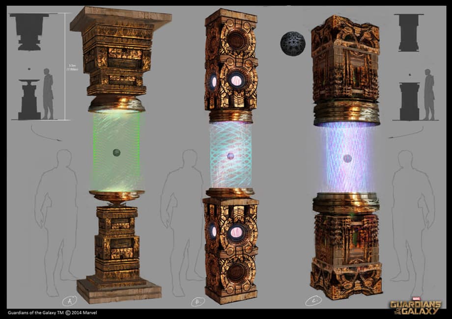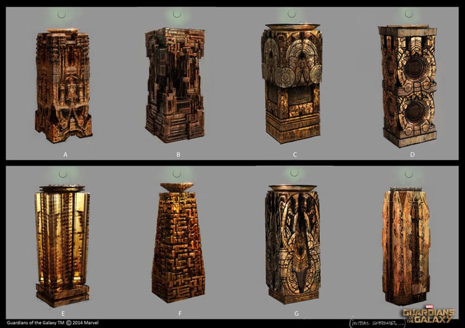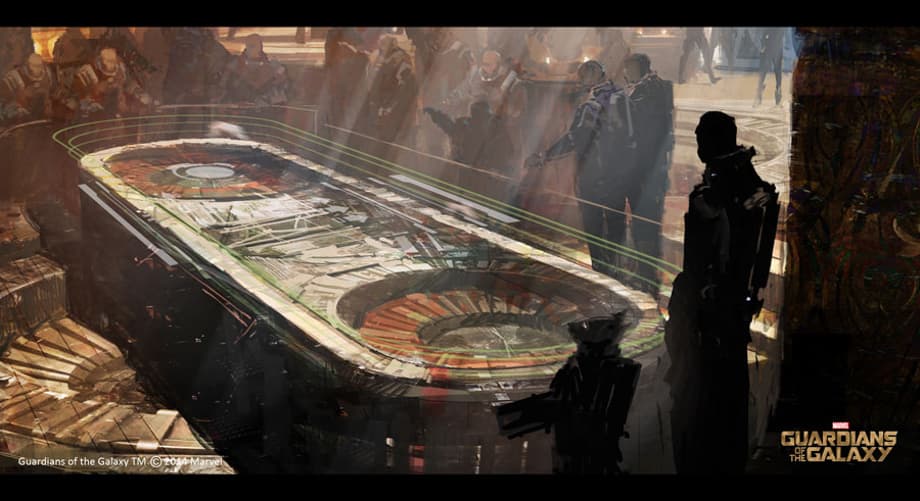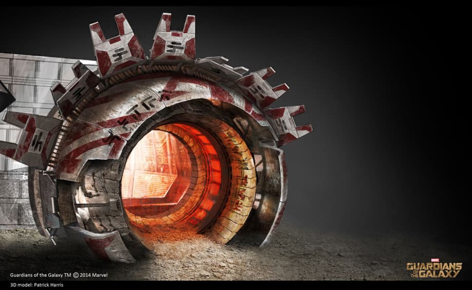 The first set of design, by Bob Cheshire ("Wrath of the Titans"), are of the abandoned world of Morag. This is when we first meet the present-day version of Peter Quill/Star-Lord ("Chris Pratt") as dances to Redbone's “Come and Get Your Love”. There's also designs for the special chamber that housed the orb. Then there are designs for the alien bar and The Collector's collection, which are located on Knowhere (inside of a Celestial's fossilized head). The final set of images are of Ronan's enormous warship, The Dark Aster.
