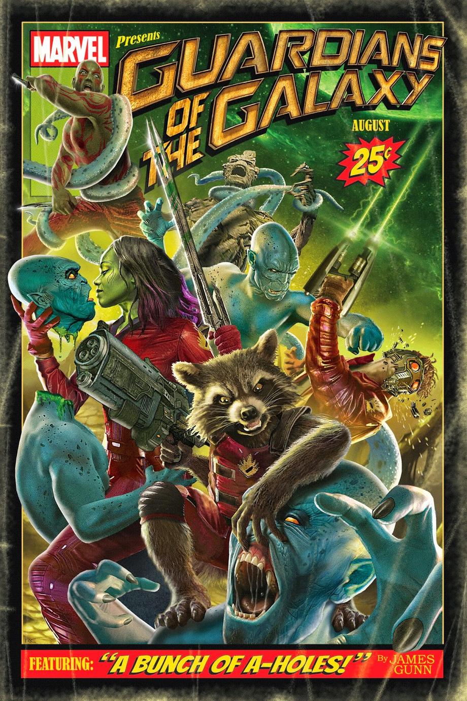 In anticipation of Marvel Studios' upcoming space epic adventure flick, Guardians of the Galaxy, fanboy and artist Rob Csiki has crafted a stunning, vintage piece of artwork that has even garned the attention of writer/director James Gunn. The poster features Marvel's cosmic misfits Star-Lord, Gamora, Drax, Groot, and Rocket Raccoon all putting up a good fight against a horde of tentacled aliens. In explaining his creative process, Rob Csiki told Guard the Galaxy that it was truly a labor of creative love. "I started with a geeky idea, a thumbnail sketch and the word's "A bunch of A-Hole's" to drive my creative concept forward. Then came some props, a small tripod, a pretty cheap digital camera and my living room and kitchen as a photo studio. I modeled all the poses in the shot and began the long task of laying out the composition in Phototshop. The rest is about 200 or so Frankenstein layers of reference textures, images, and lot's of digital painting to make it all whole. This is a true hybrid piece of pop art! I used everything I taught myself over the years physical & digital art-wise that I am truly excited by the finish product."
