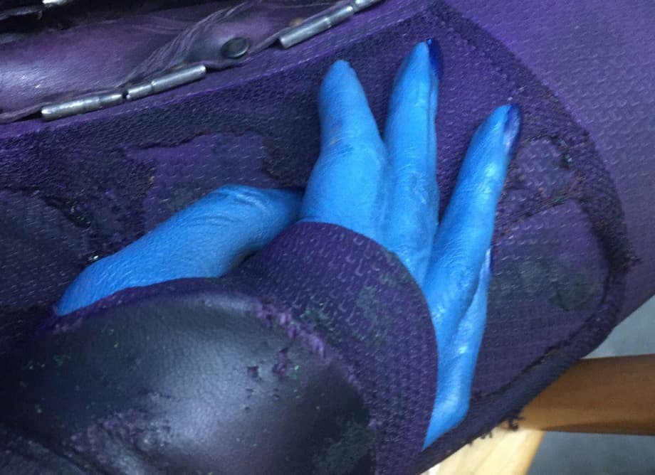 Yes, that is just a picture of Karen Gillan resting her now blue hand on her purple-clad thigh - but believe it or not this marks the first time we've had a glimpse of an actor in full costume as their character on the set of James Gunn's Guardians of the Galaxy Vol. 2.