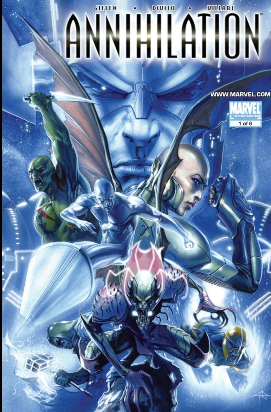 The series itself (Oct. 2006-Mar. 2007), by Keith Giffen & Andrea Di Vito, tells of an army of Annihilus, called the Annihilation wave, to conquer our universe, apparently with the help of Thanos (honestly, at this point, I’ve lost track of this guy's motivations). Richard Rider is the central character, while Peter Quill is something of a witty sidekick for him. Gamora is also featured as having left Adam Warlock, and once again become a ruthless assassin. Drax is released from the Kyln and manages to kill Thanos. Before the wave is ultimately repelled, Annihilus kills Quasar. The bands are taken by the original Captain Marvel’s daughter, Phylla-Vell, who from then on, becomes the new Quasar.