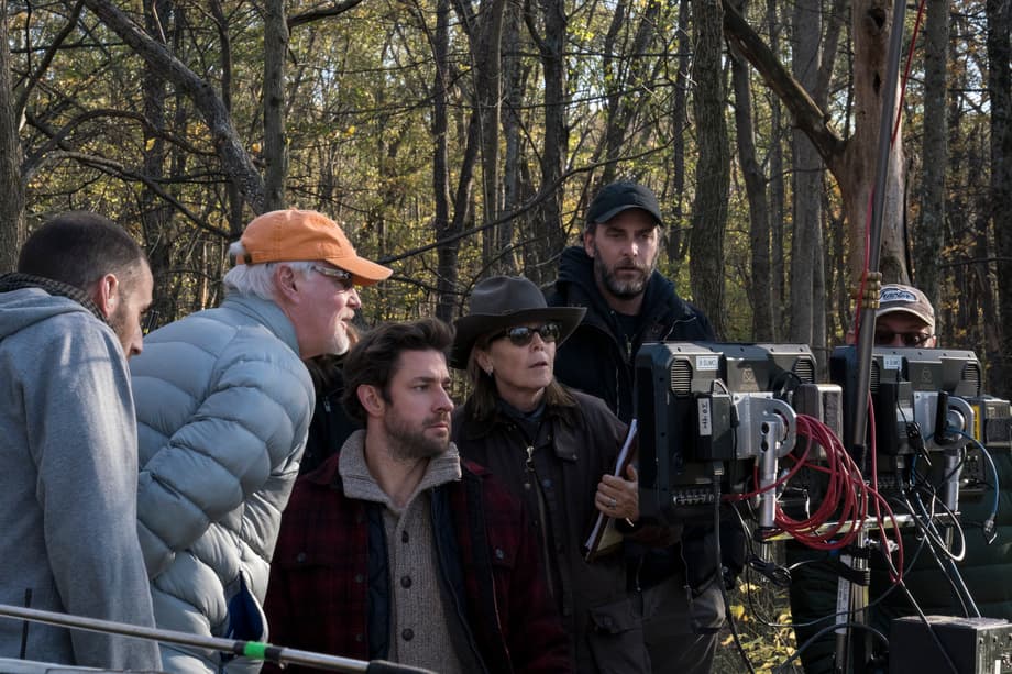 Left to right: Director of Photography Charlotte Bruus Christensen, Emily Blunt and Director/Writer/Executive Producer John Krasinski on the set of A QUIET PLACE, from Paramount Pictures.