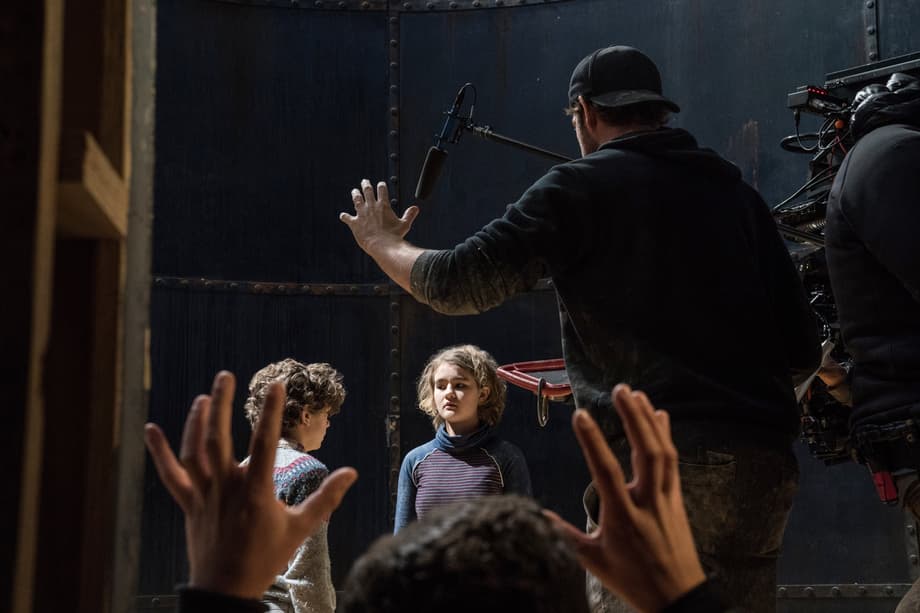 Left to right: Noah Jupe, Millicent Simmonds and Director/Writer/Executive Producer John Krasinski on the set of A QUIET PLACE, from Paramount Pictures.