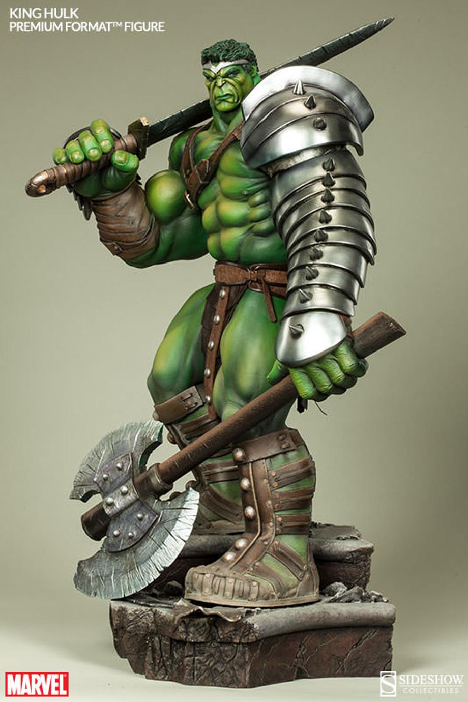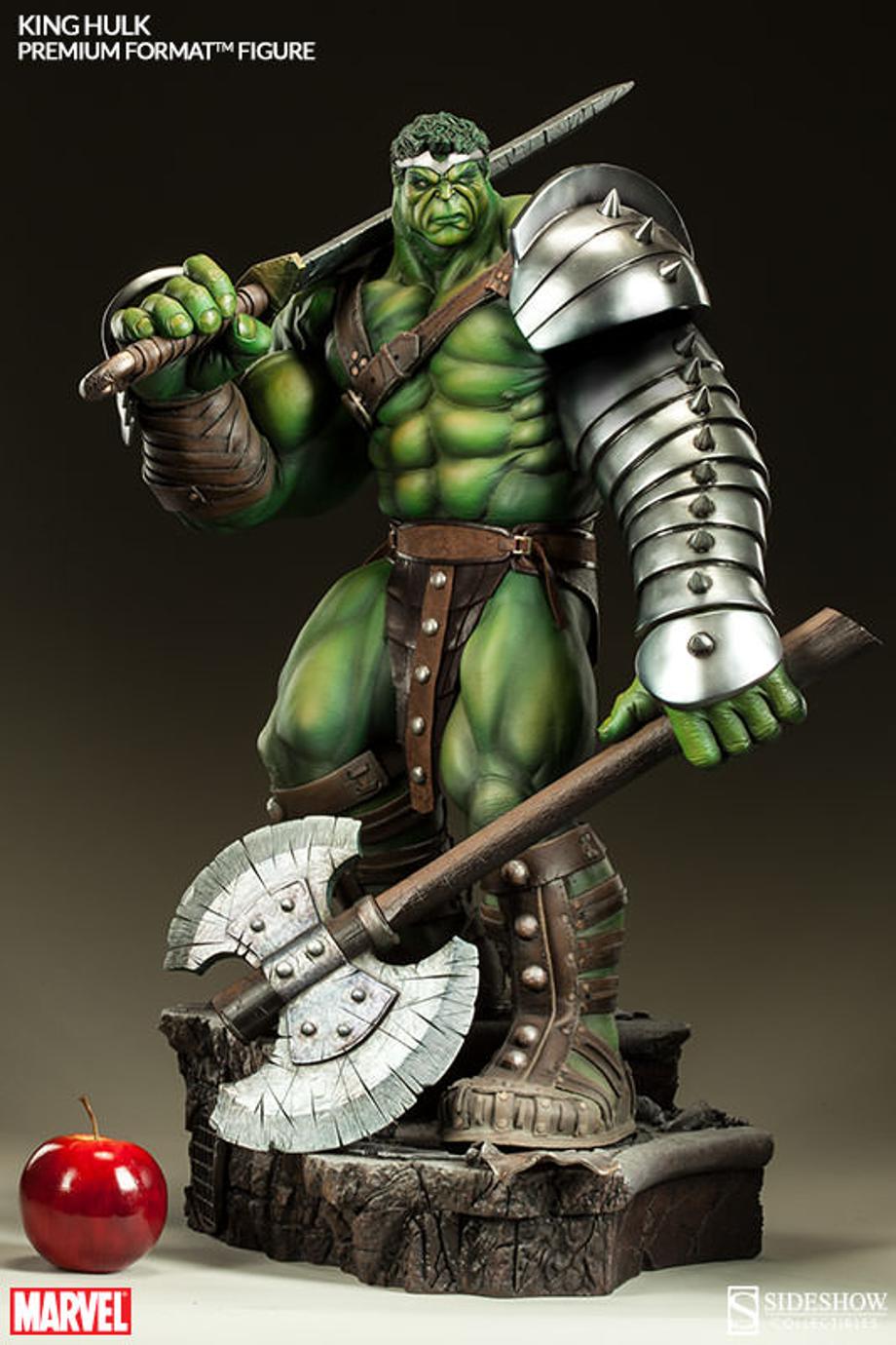 Fueled by rage, and stronger than ever before, the volatile King Hulk is out for blood, girded for war in his gladiator attire and spiked armored gauntlet. Wielding a massive broadsword and deadly battle axe, the unstoppable World Breaker returns to seek vengeance and tear the Earth to shreds. Towering almost 30" tall over the cracked and broken streets of New York City, he is the Green Scar, the Eye of Anger, the Hulk... and he has come home.