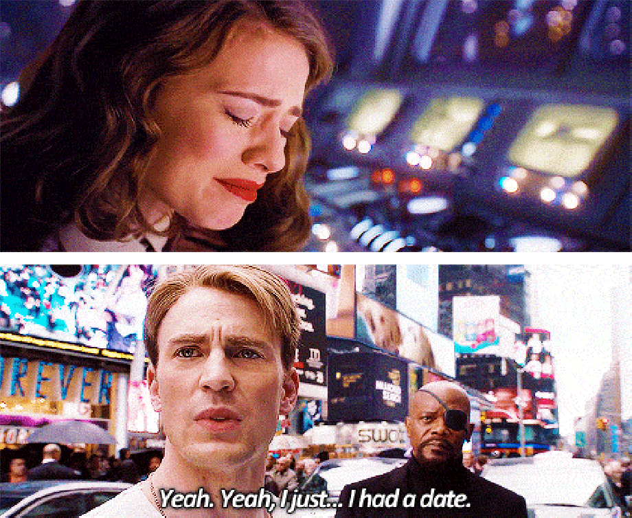 During the climax of the movie, Steve Rogers and Peggy Carter make date plans as he drives the plane into the water. Throughout the movie, there is an unspoken love between the two and its when Steve realizes that he probably won't make it out of the crash. He then informs Peggy that he might have to take a reschedule their date. Upon waking up in modern day New York he is informed that he had been asleep for over 50 years. When Steve looks around and seems confused, the audience are left to believe he is just struggling to get used to the fact but we realize that isn't the case when responds to Nick Fury's question if he'll be alright by saying 'Yeah. Yeah I, I just... I had a date.' This really struck home for me. As it showed the hero doesn't always get the girl .