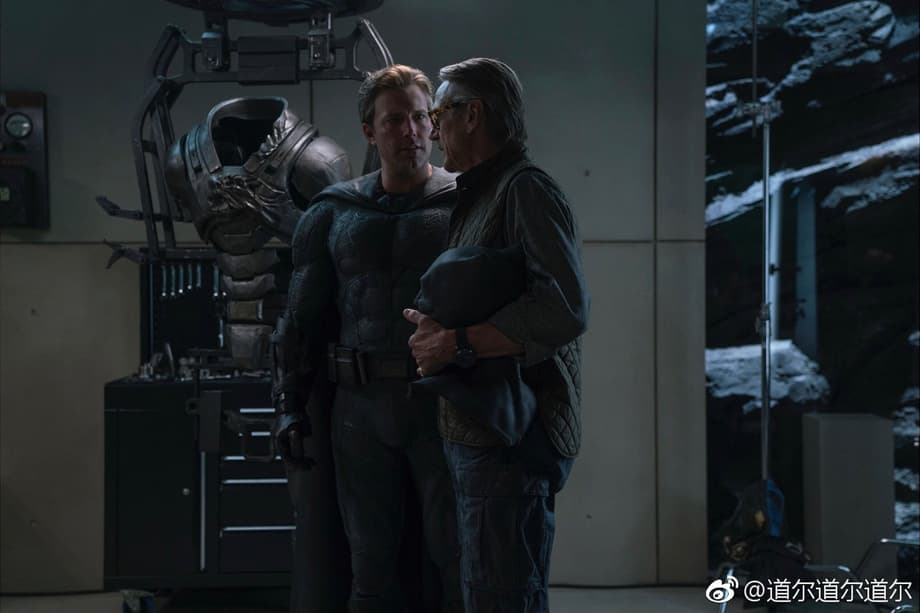 What appears to be a tense moment between Bruce Wayne (Ben Affleck) and his loyal "butler" Alfred (Jeremy Irons).